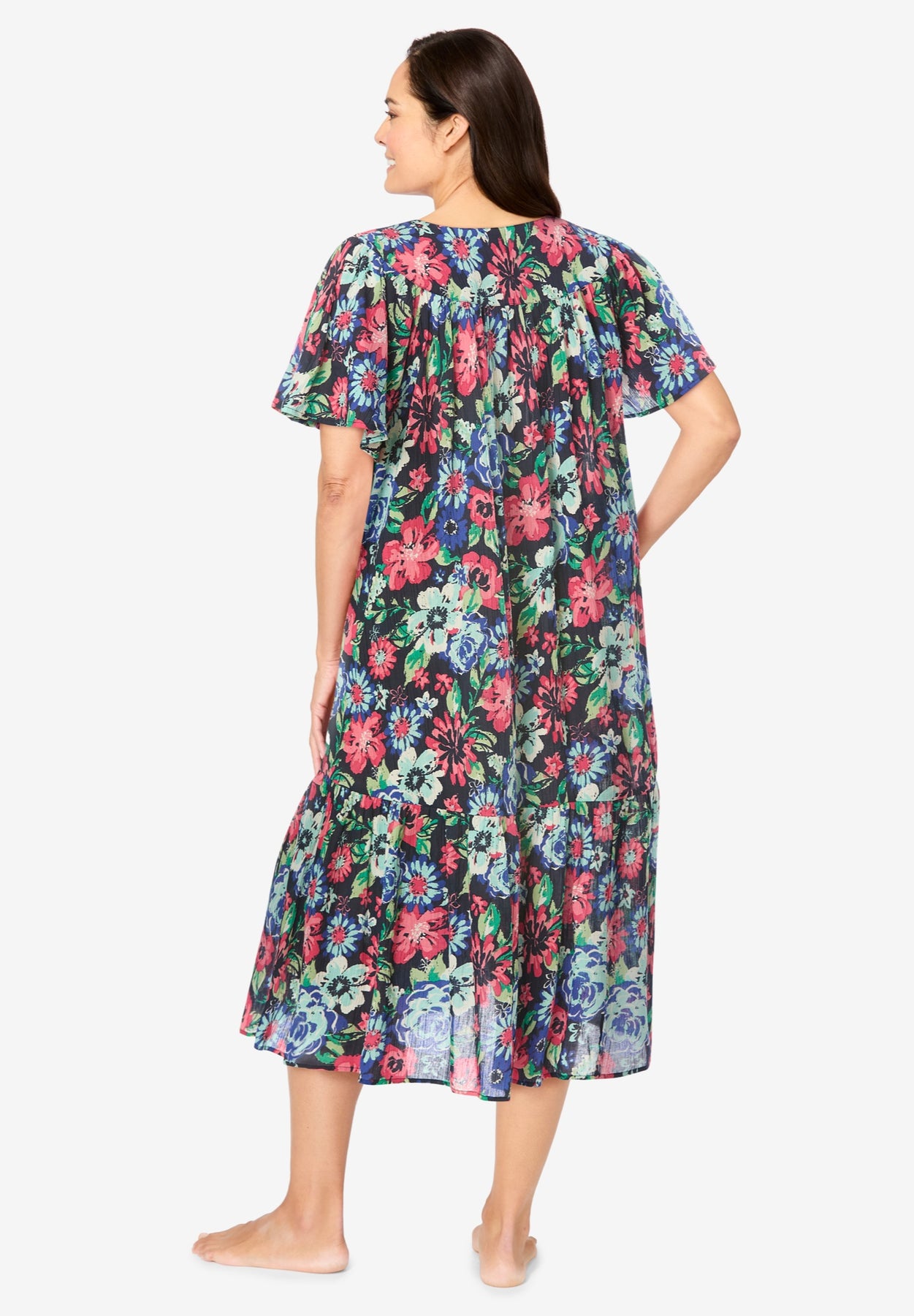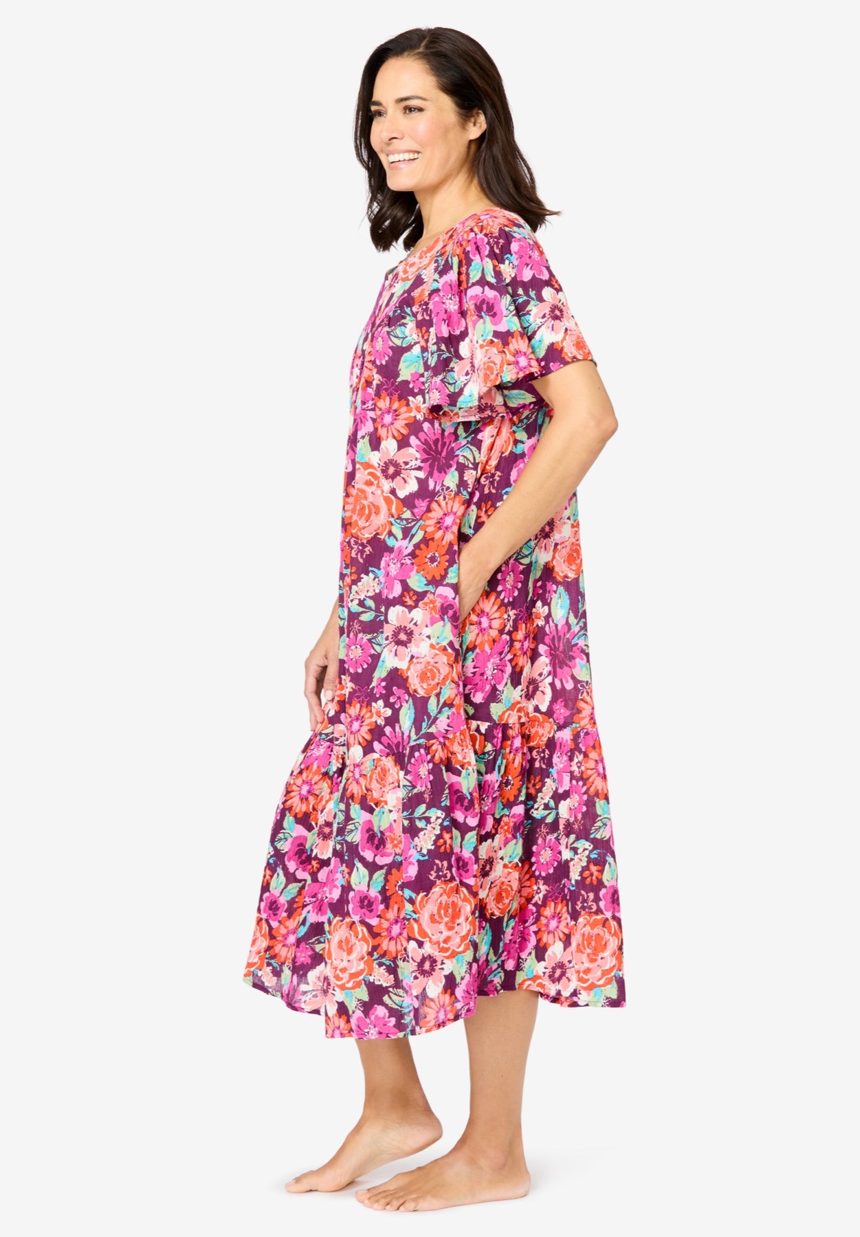 Lounge around in this airy Gauze Lounger. Relaxed v-neckline with neck shirring. Elbow length raglan sleeves and tiered bottom. Side pockets to carry your essentials.