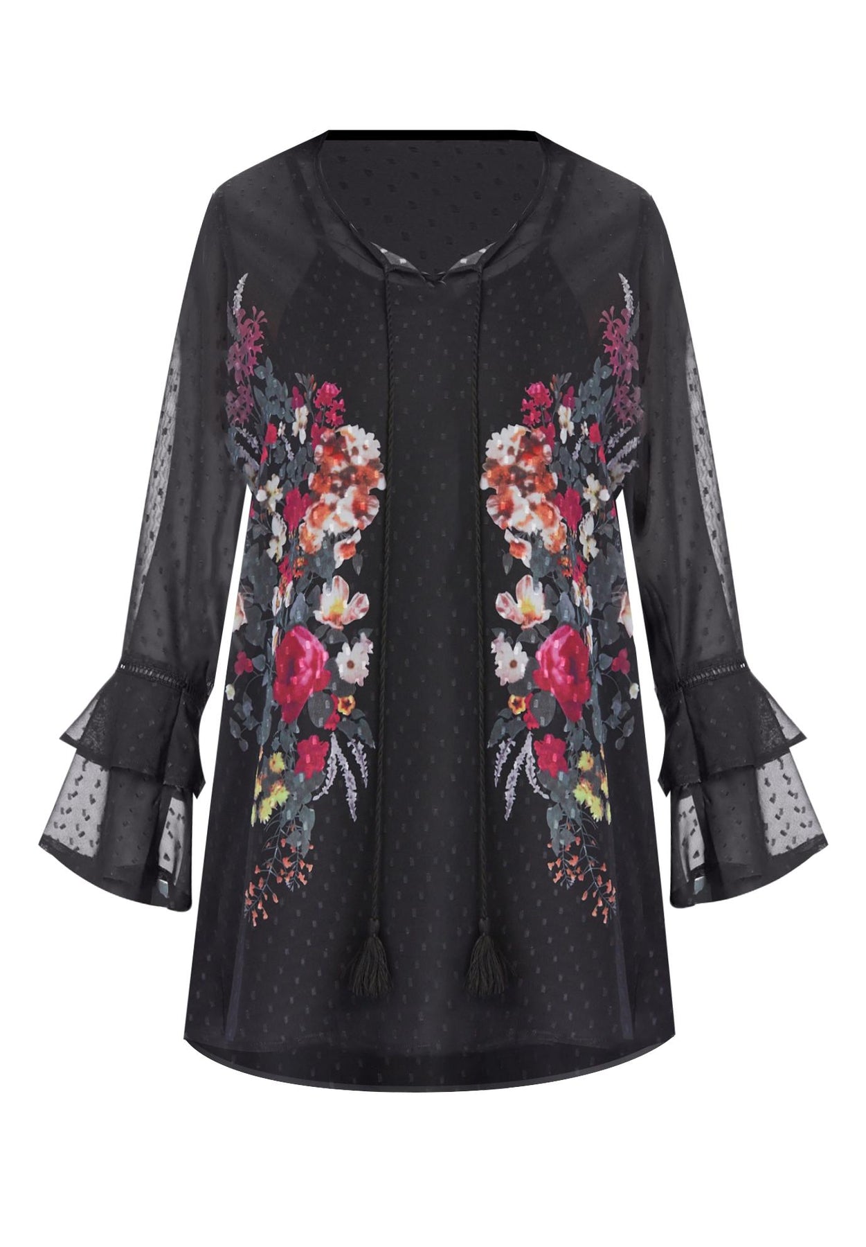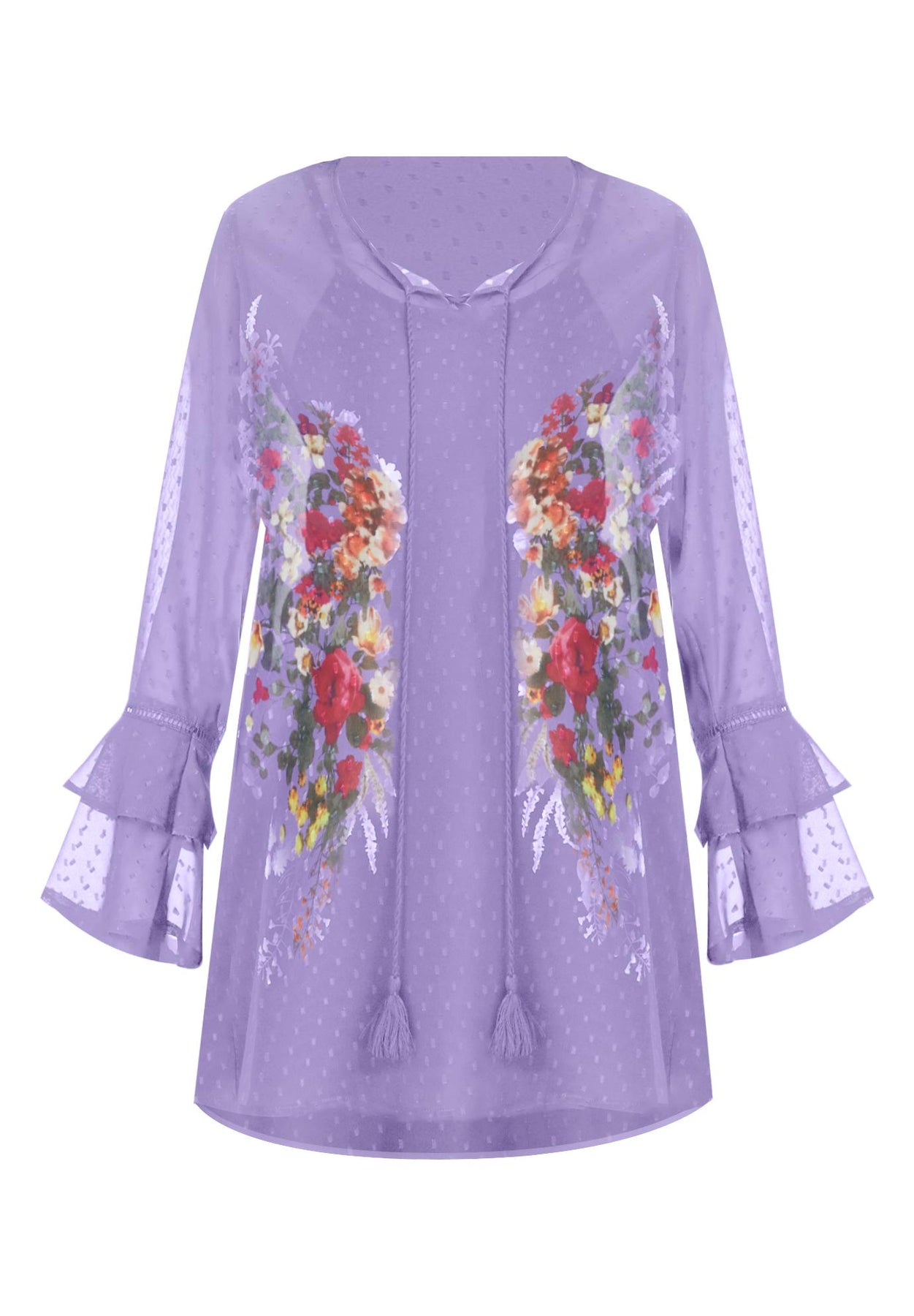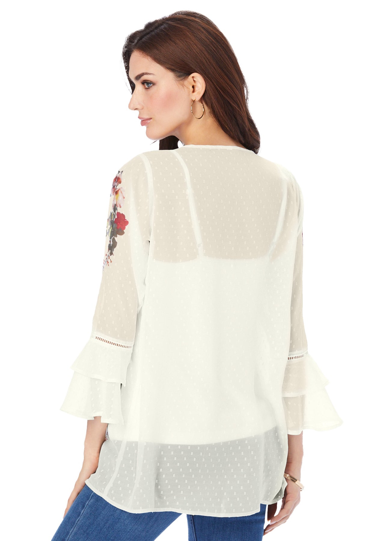 The perfect balance of sweet and feminine, this lightweight top is defined by its textured Swiss Dot fabric. Cut for a free-flowing fit with equally swingy lace-trimmed three-quarter sleeves. Tassel ties at neckline. Unlined.