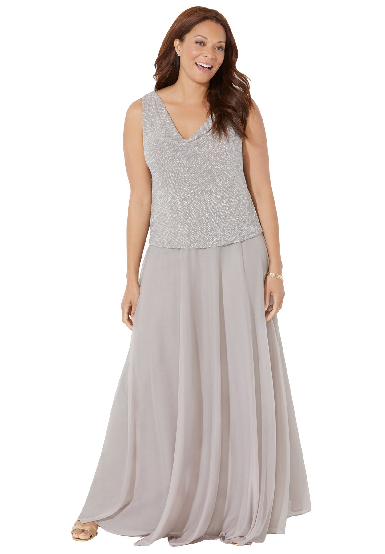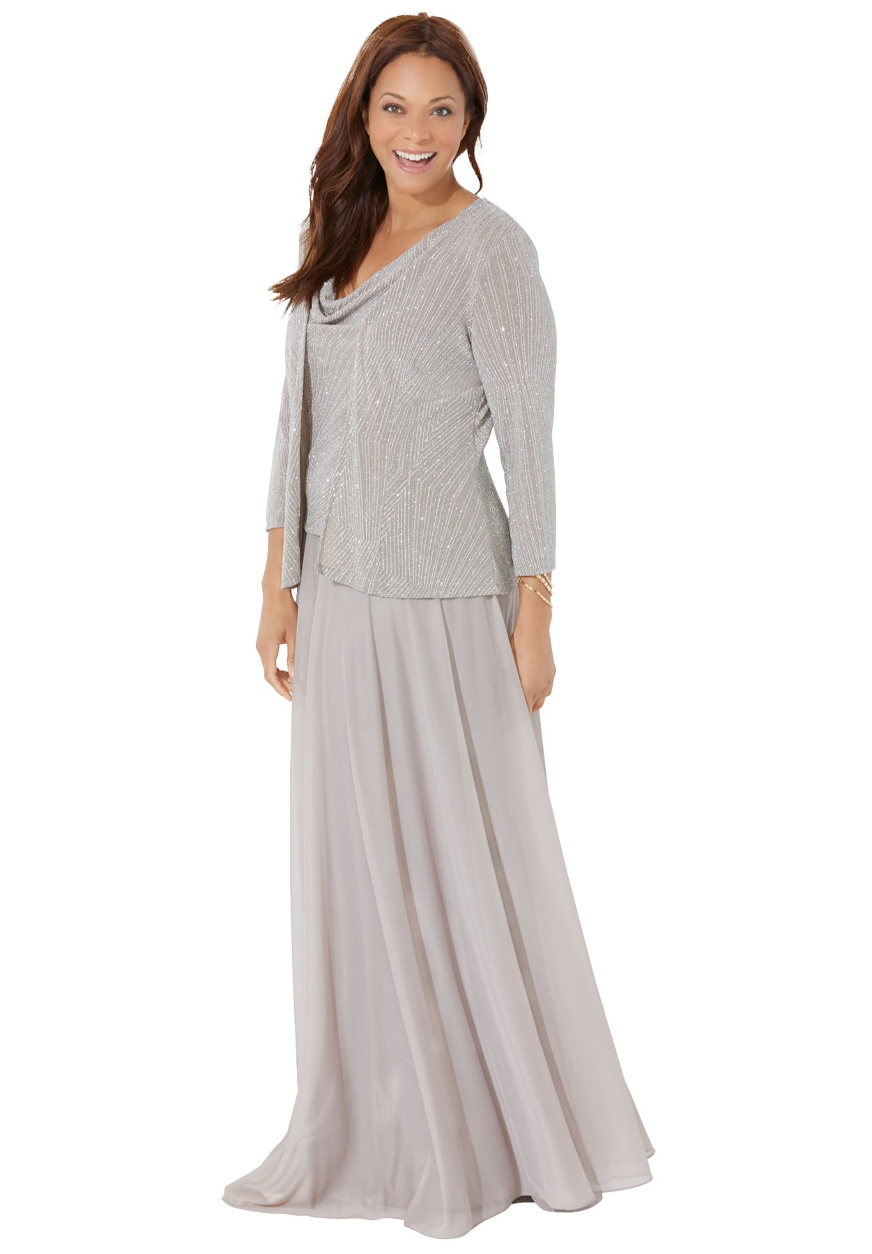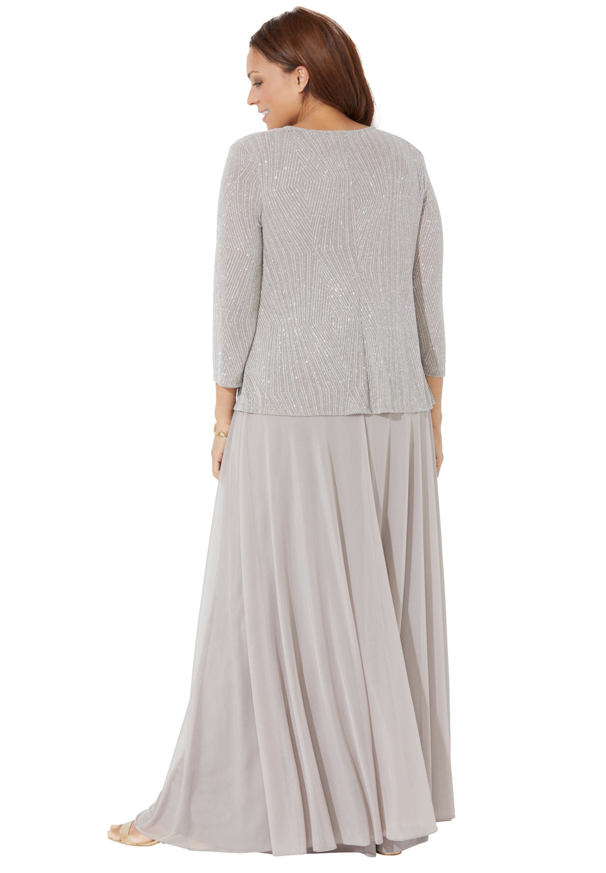 FIT: Jacket is soft, open and flowy with 3/4 sleeves. Dress has a soft, draped neckline and full, sweeping skirt with overlay.