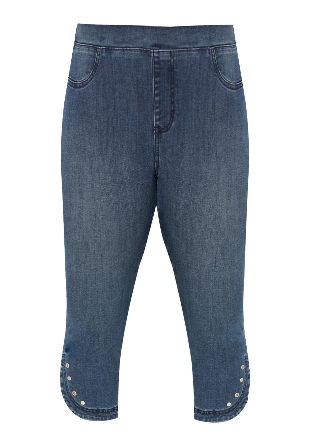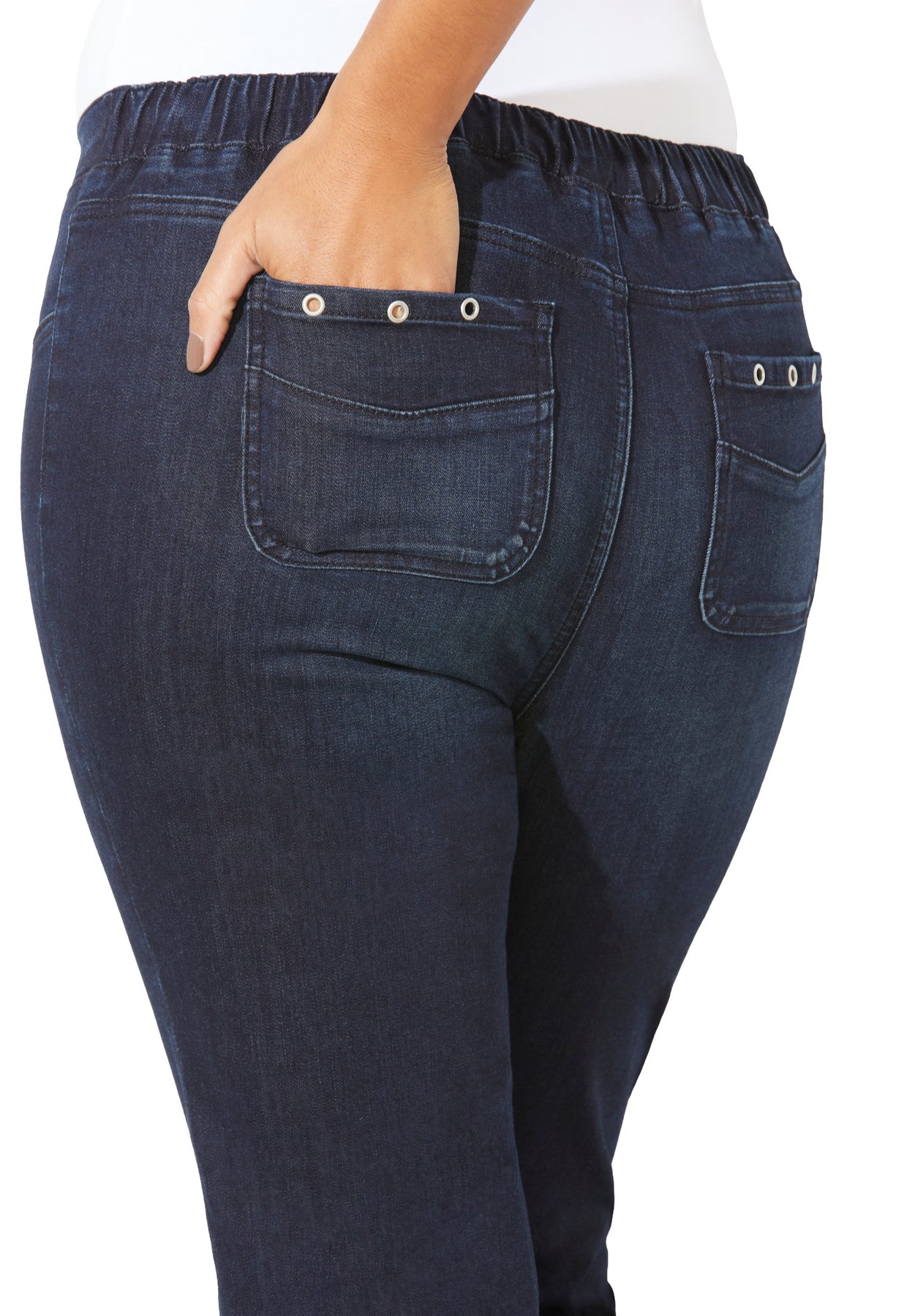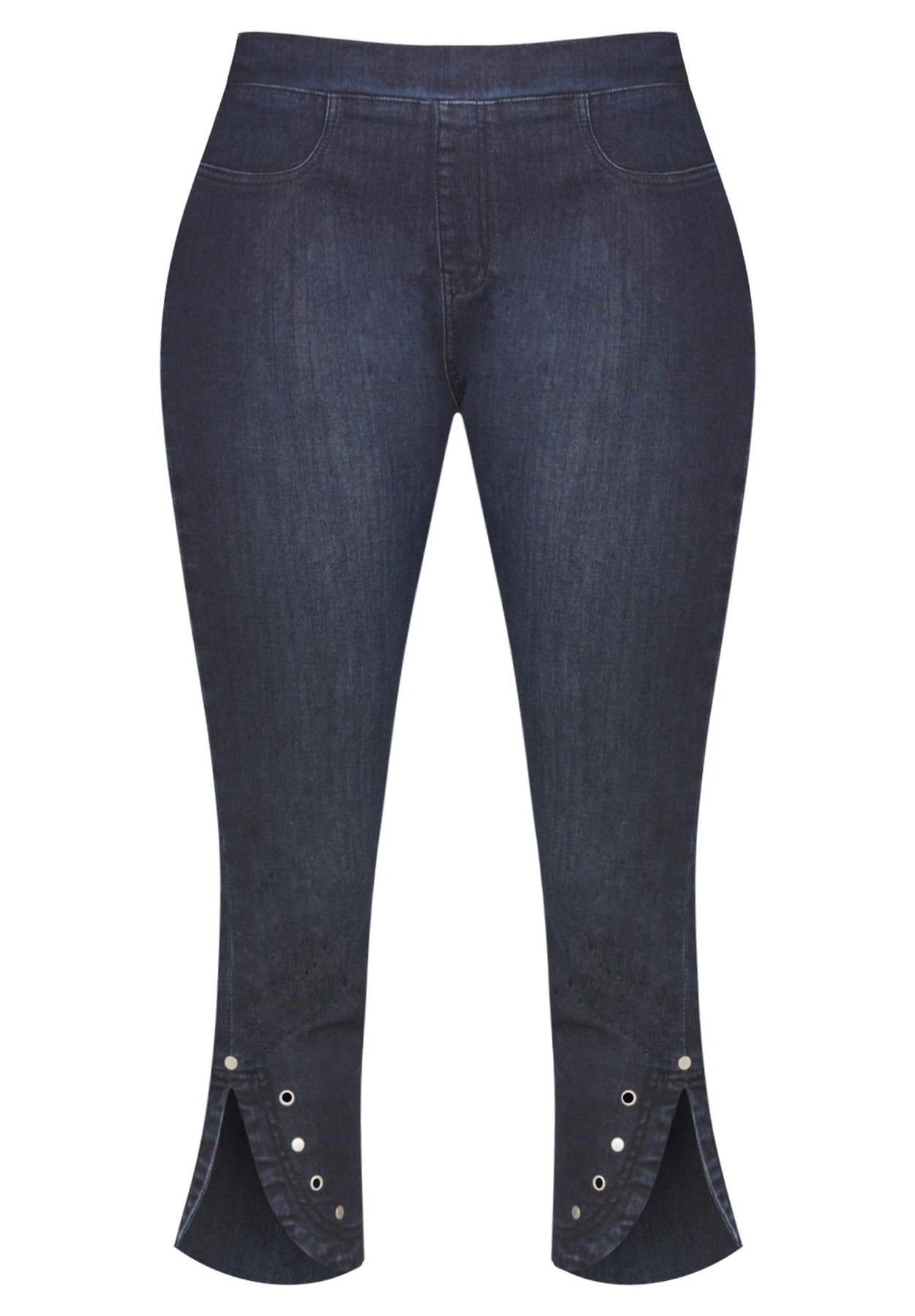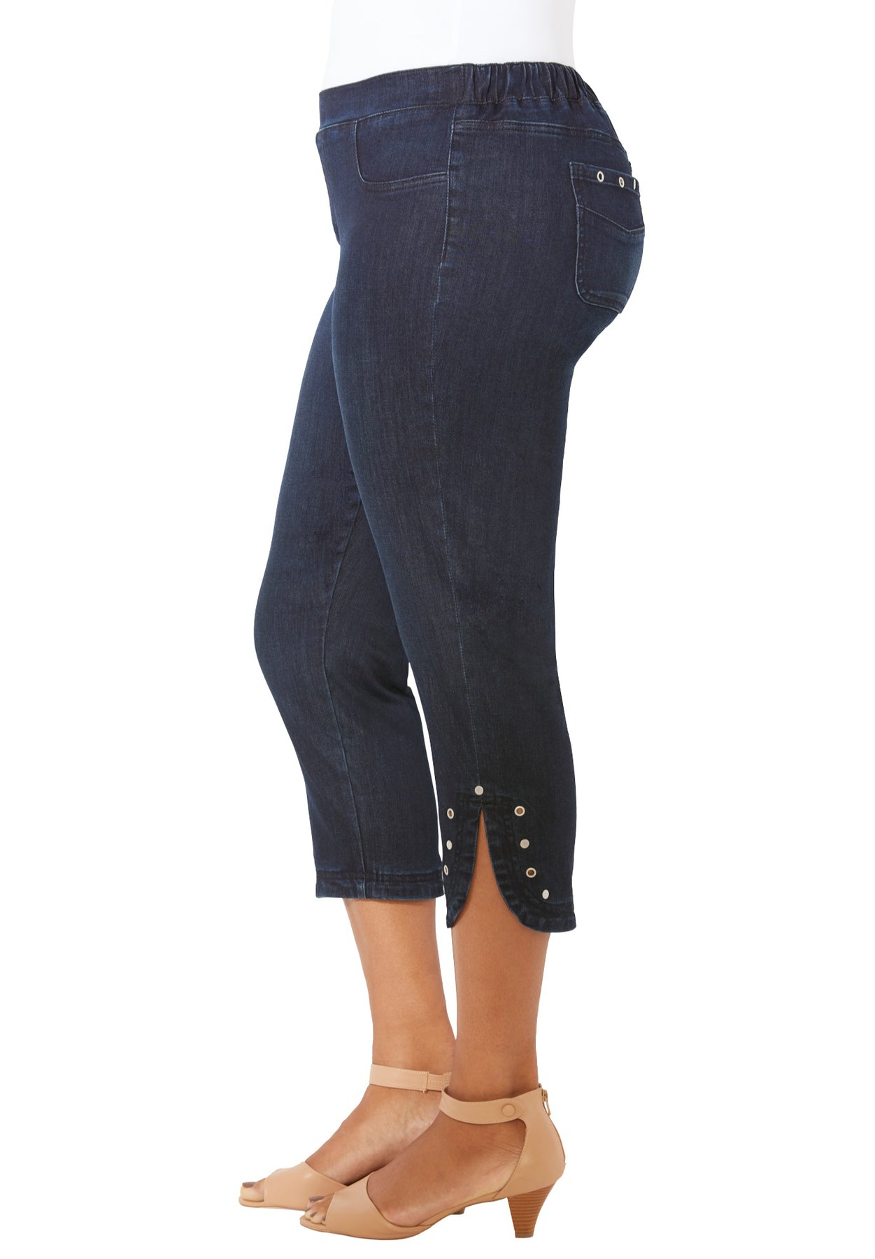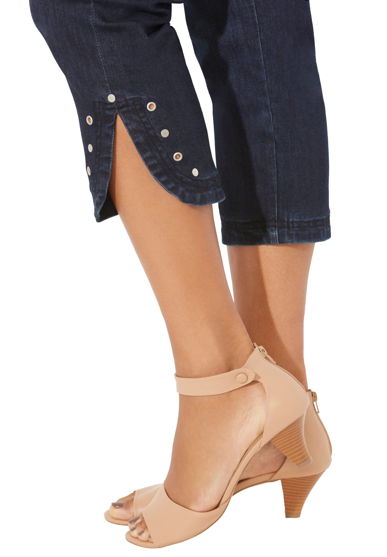 A comfy capri to brighten your outfit (and your outlook). With its smooth flat-front waistband and elastic back, this easy capri combines a polished look with an ultra-comfortable design. Rhinestone trim at the side-slit ankle adds a little sparkle.