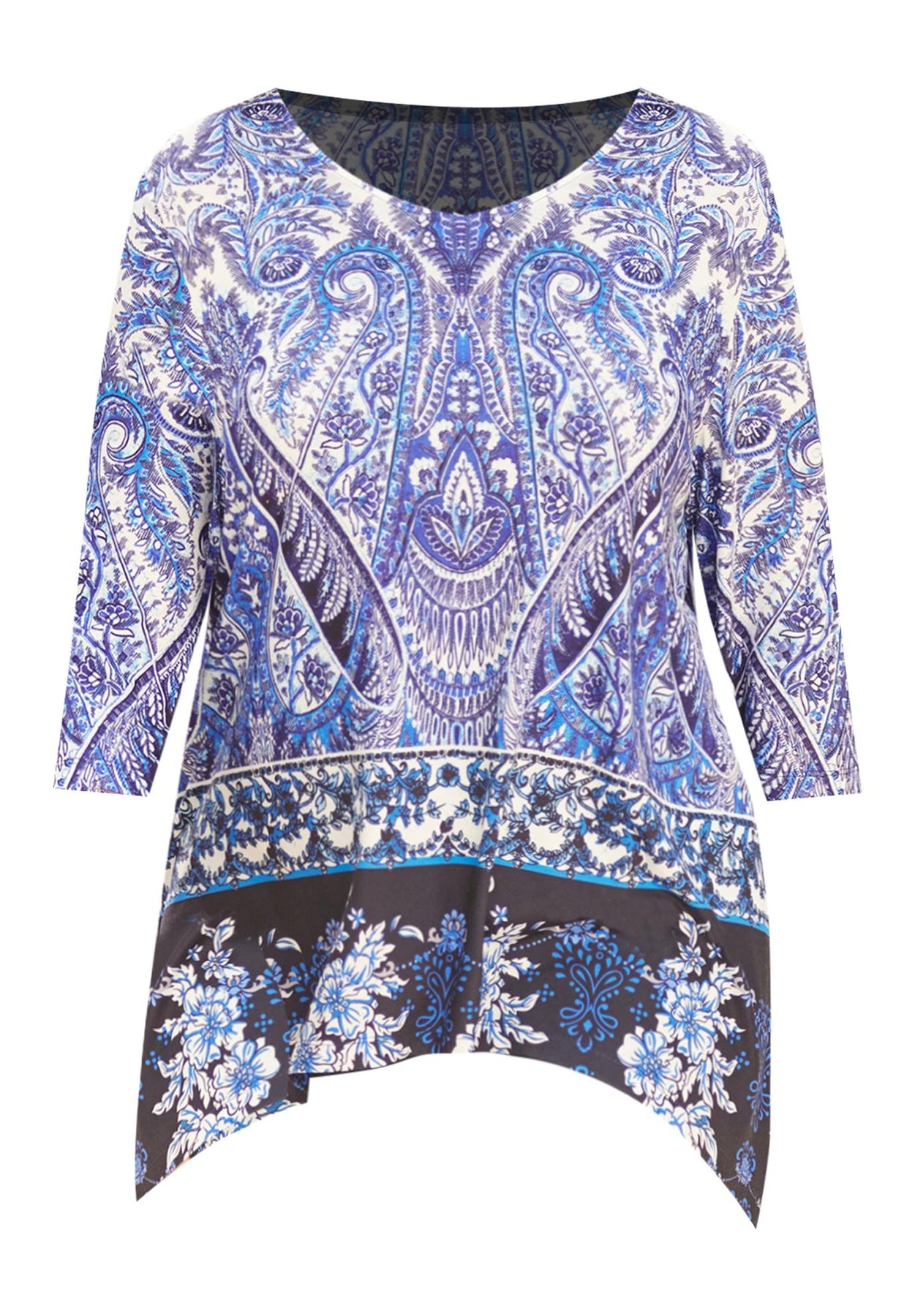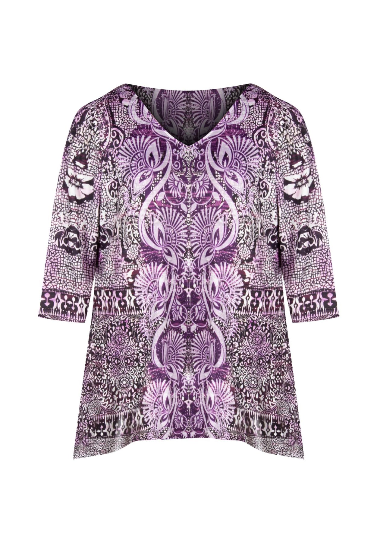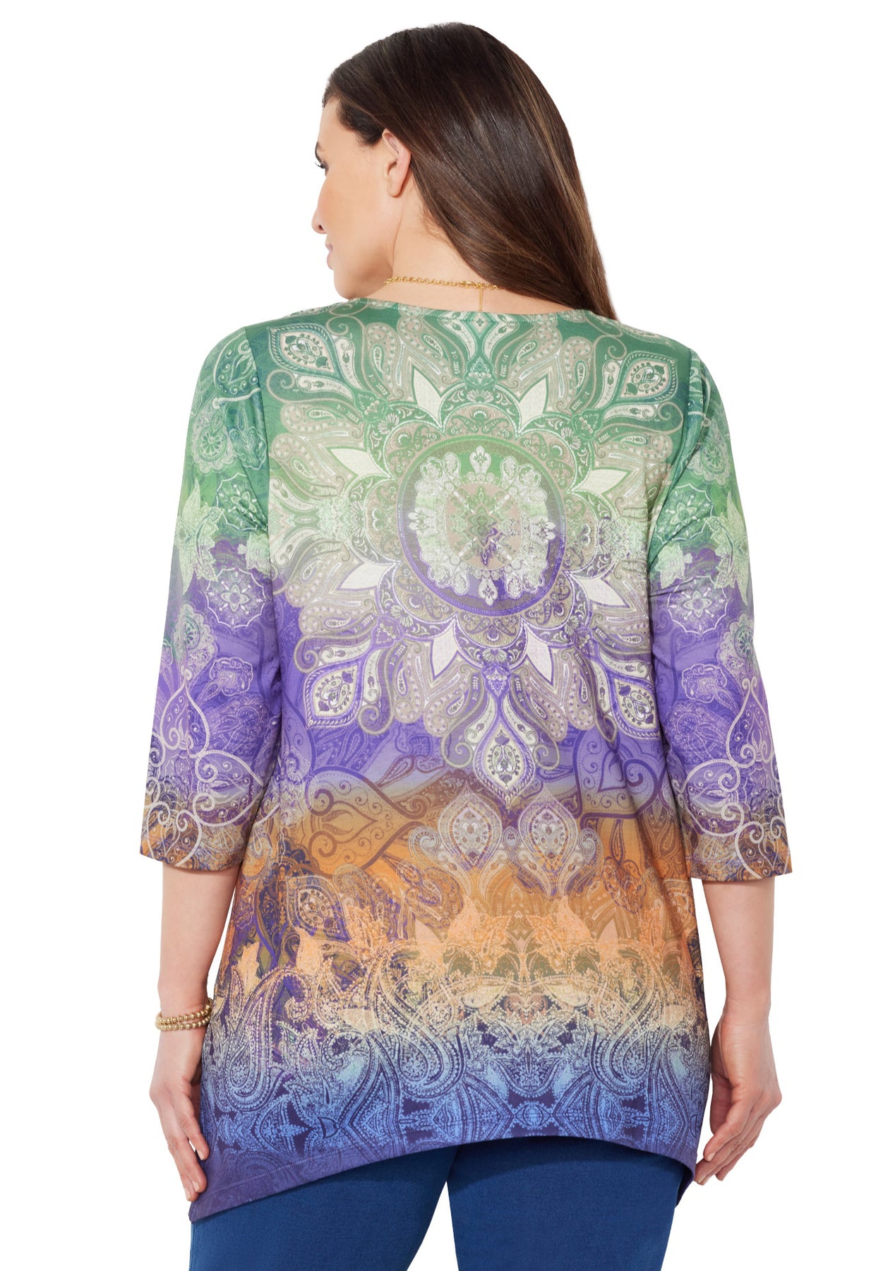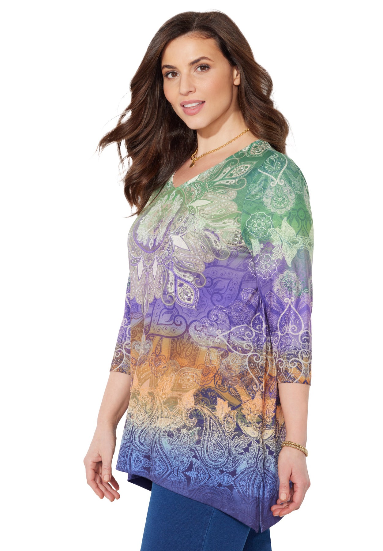Think of it as art to wear. A fresh palette of color of print combine to create this statement-making tunic with sublimated print technique. The shape is equally artful with its asymmetrical hemline culminating in longer points at the sides. FABRIC: Soft, smooth fabric is lightweight, comfortable and cool to the touch. Skims the body beautifully without clinging. FIT: Long, lean silhouette with a figure-flattering two-point hem for a little extra coverage. V-neckline. 3/4 sleeves.