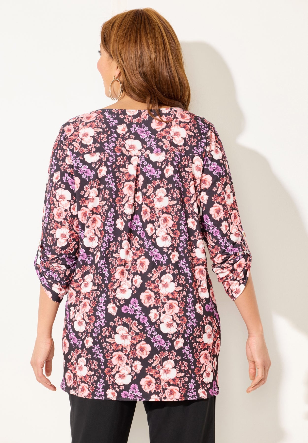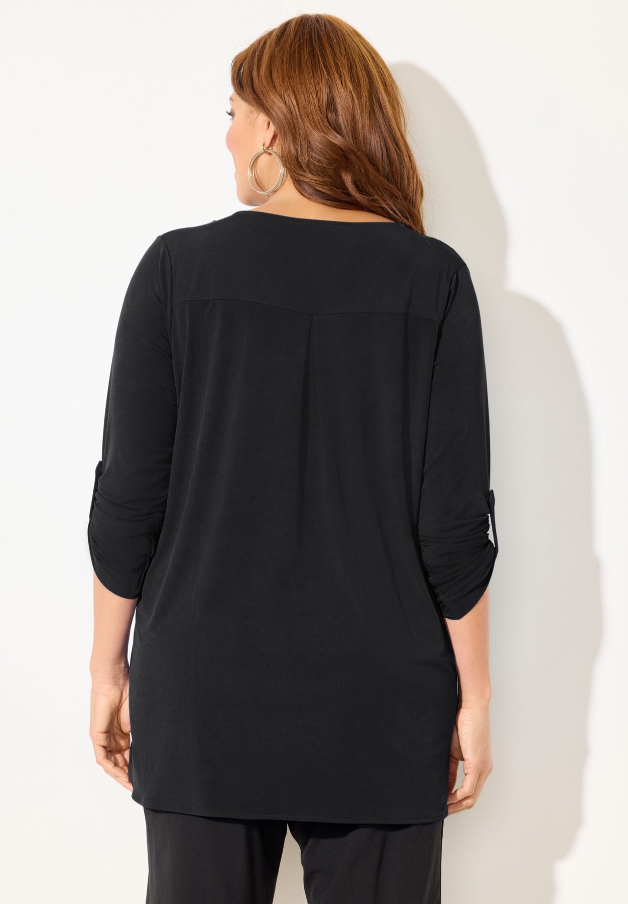 Endlessly stylish yet comfortable for all-day wear, this relaxed, drapey top features a V-neckline with statement zipper detailing. The smooth, lightweight fabric flows beautifully while roll-tab sleeves bring a touch of effortless flair. Plus the soft, smooth fabric has a touch of stretch for easy movement. A must-have staple for any wardrobe.