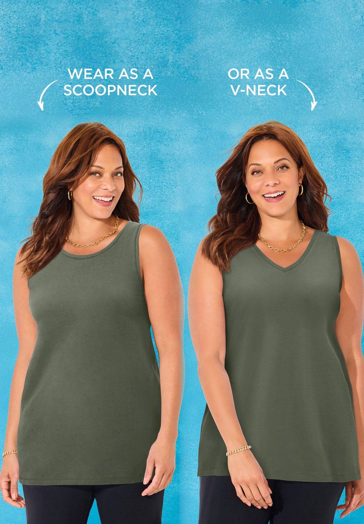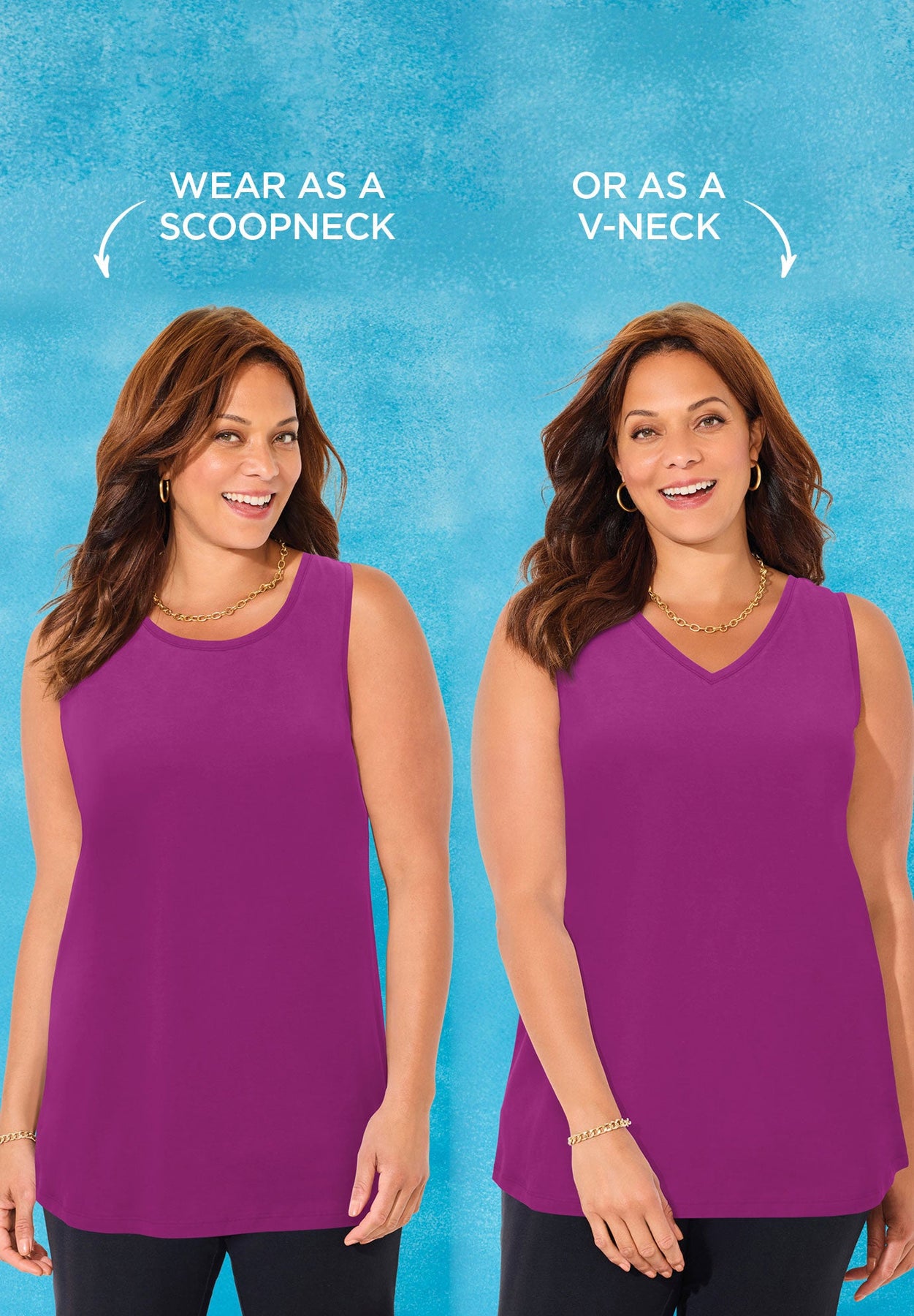 Our Suprema® layering tank adds effortless beauty to any outfit — and it’s reversible! Wear it with the V-neck in front for a flattering neckline, or flip it around for a classic scoop neckline look. Get twice the style in one easy tank!