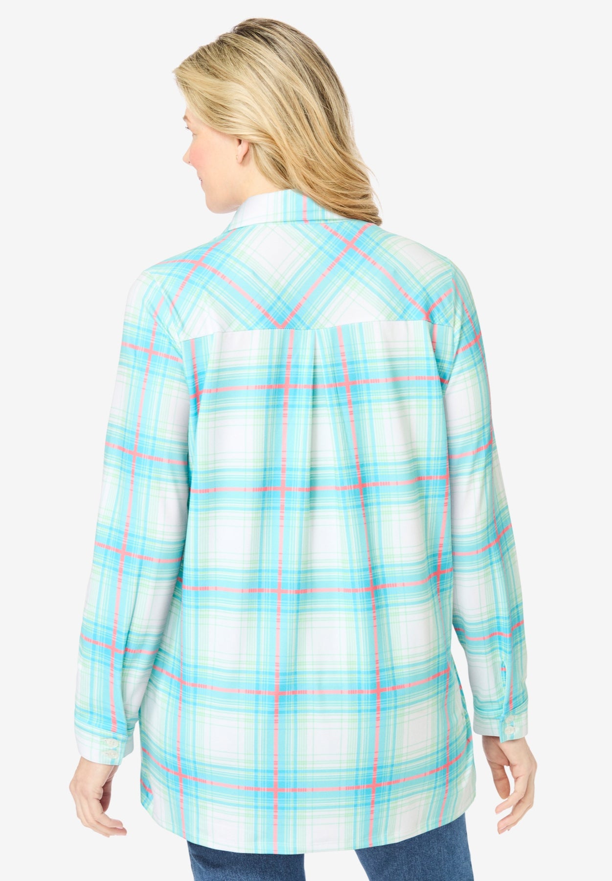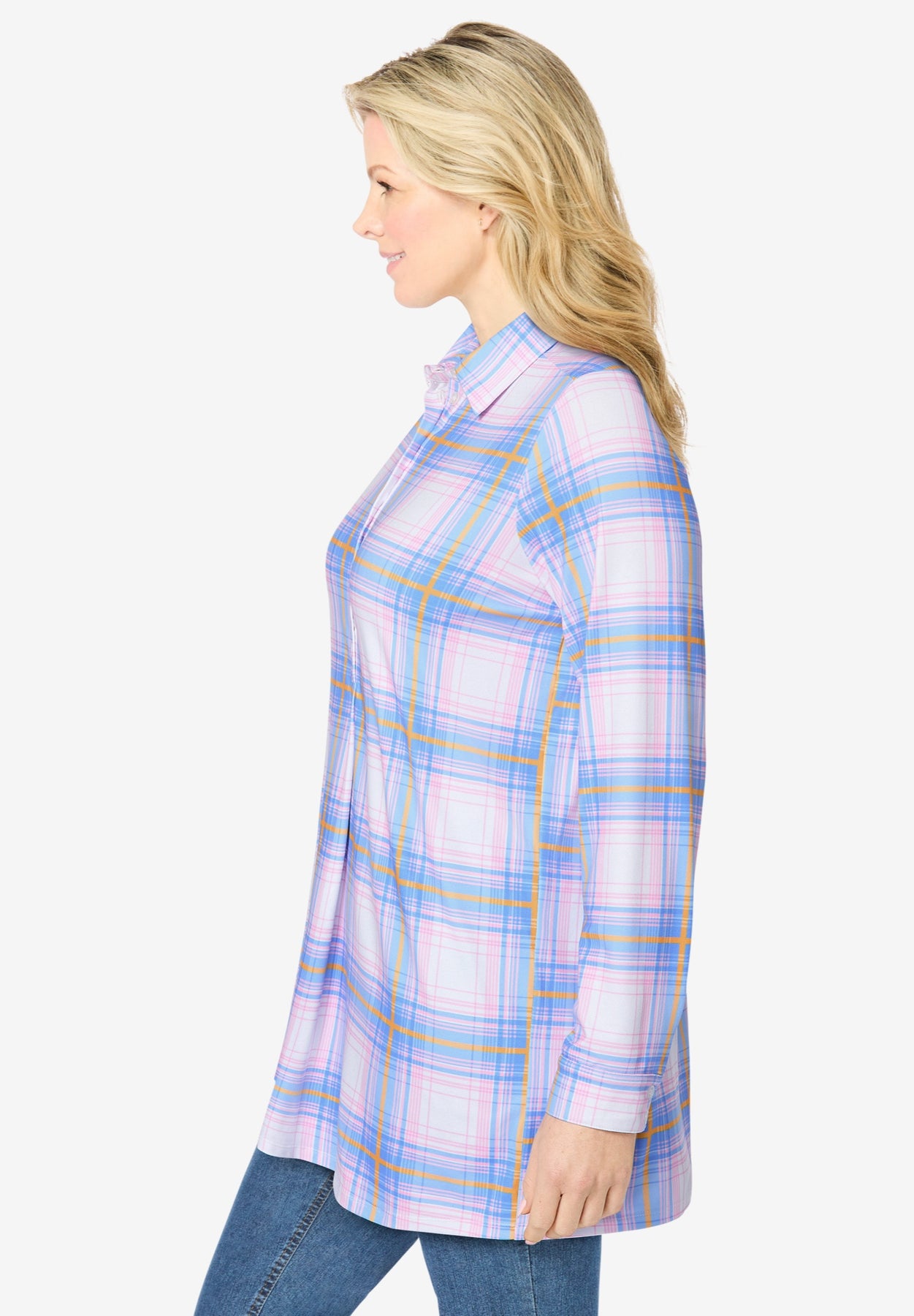 The classic flannel shirt gets an upgrade! Our Plaid Knit Tunic With Collar combines the cozy feel and look of flannel with a flattering A-line silhouette. It's long enough to wear with leggings or with any of your favorite bottoms.