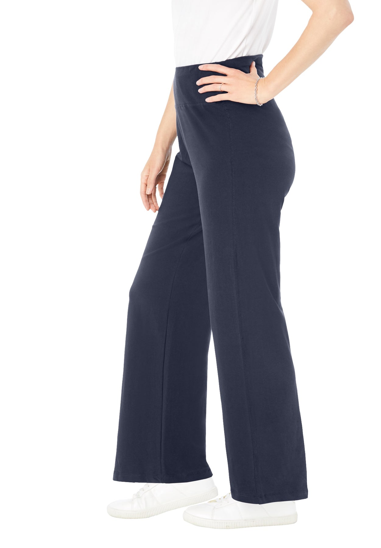 Start a great athleisure outfit with these stretch cotton knit pull-on wide-leg leggings! Ideal for everything from lounging to running errands, they offer a comfy, flexible fit that moves with you. The fully covered elastic waistband ensures all-day ease. Their sleek, body-hugging silhouette creates a look that beautifully contrasts with relaxed-fit tops or oversized sweaters. This combo balances comfort and style effortlessly. Plus, the breathable stretch-cotton blend keeps you comfortable all day long!