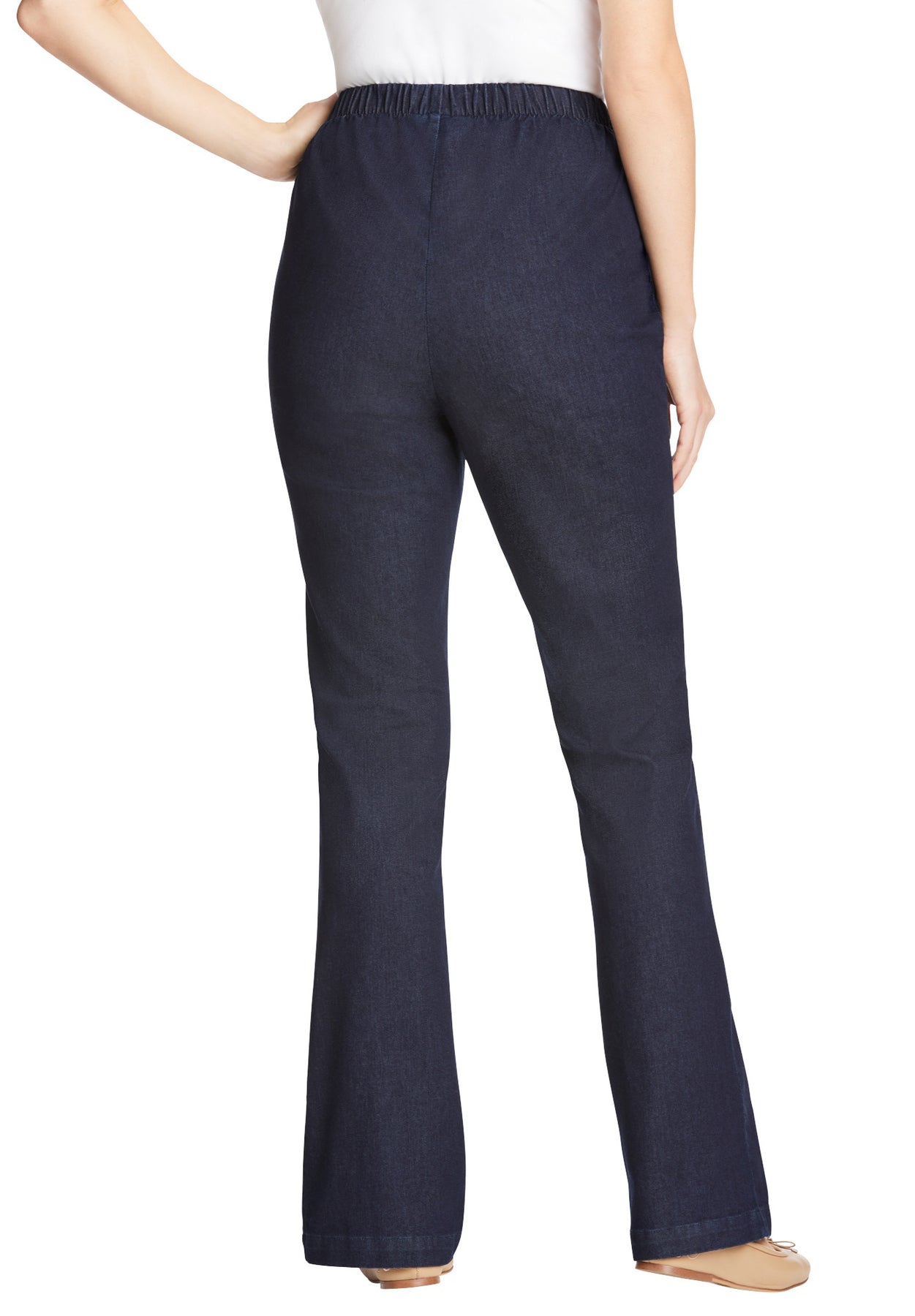 These jeans are fashioned with stretch to give you the perfect fit. Their all-around covered elastic waistband makes them even more comfortable. This pull-on style features slant pockets on the front and a pocketless back for a smooth look. These bootcut jeans have a slight flare that fits over your boots..
