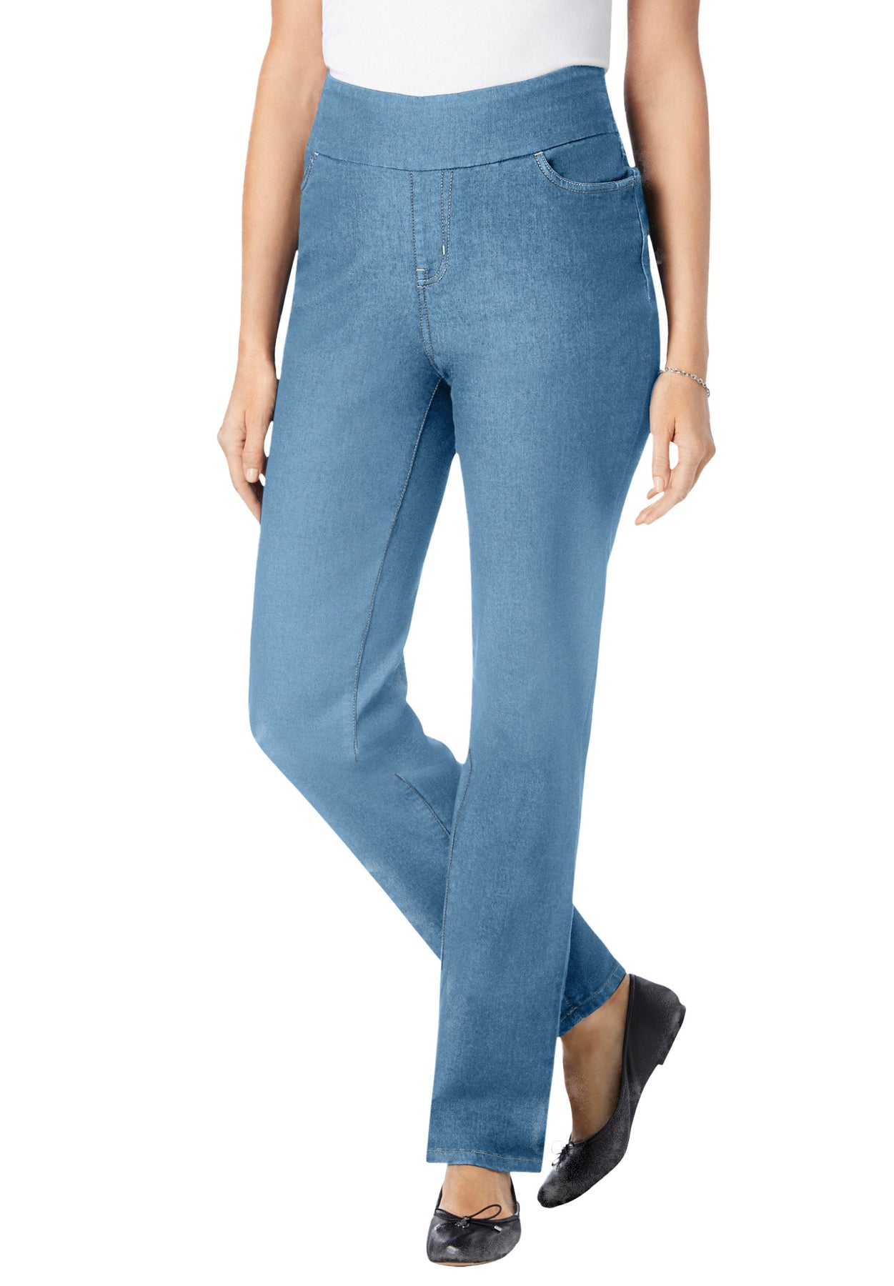 These easy, straight-leg denim jeans are designed with a full flat, no-gap elastic waistband. The jeans provide a smooth look under all your favorite tops and tunics. Enjoy the classic look of a great pair of jeans but move comfortably thanks to allover stretch.