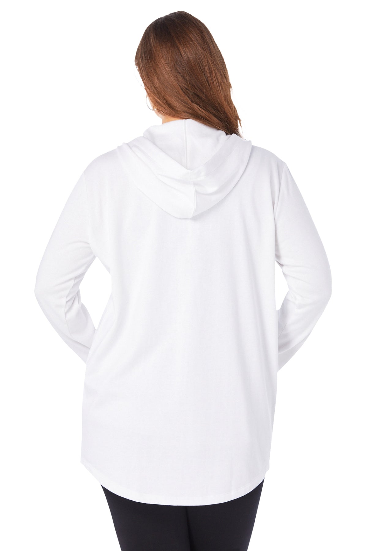 Your answer to everyday ease, this easy layer is a closet essential. Soft and comfy, with a zip front and shirttail hem for a looser style. Made extra-long to cover everything you want it to, this is the go-to over all your favorite tops and leggings. Drawstring at hood.