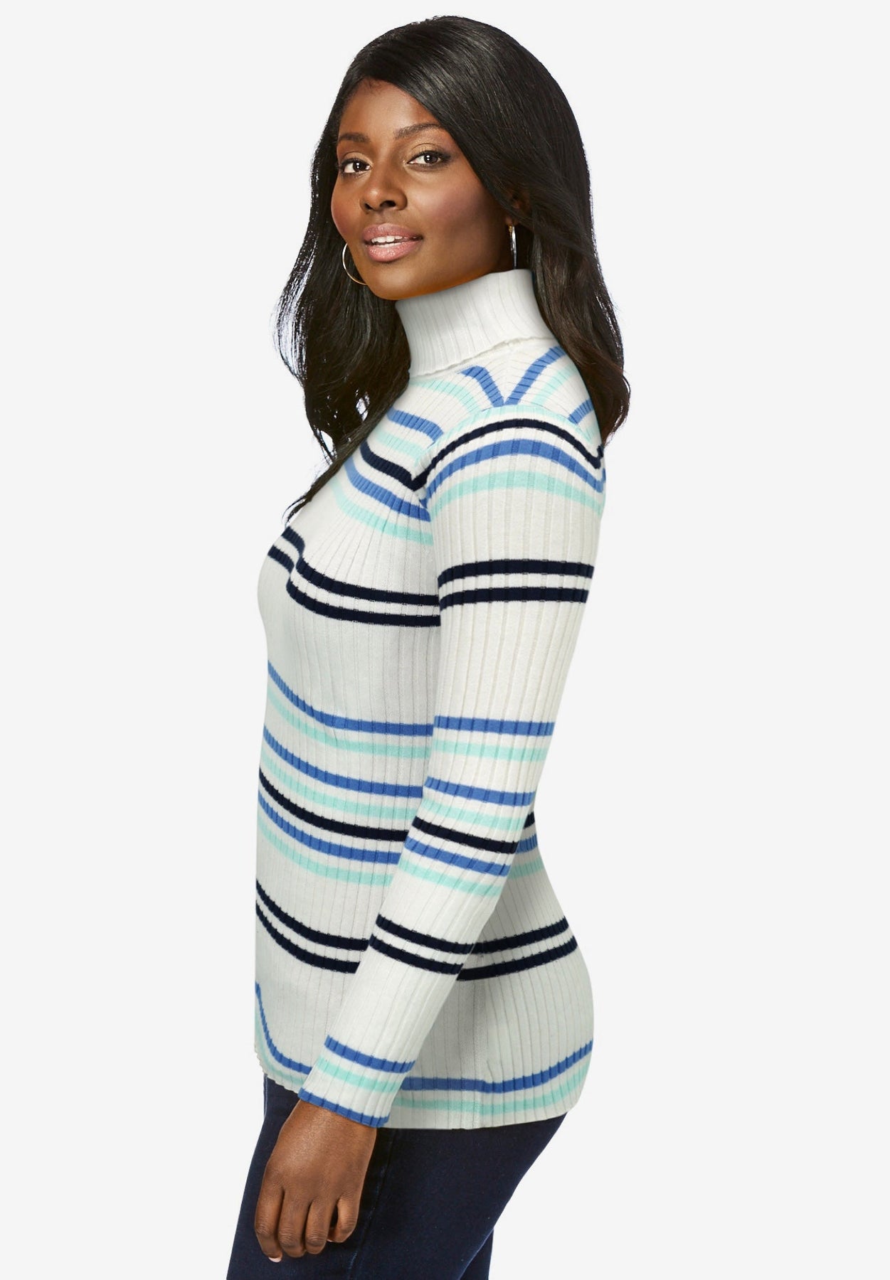 A timeless wardrobe essential for spanning the season, the Jessica London plus size women's Ribbed Cotton Turtleneck Sweater is crafted in a feel-good ribbed knit with a flattering refined fit.
