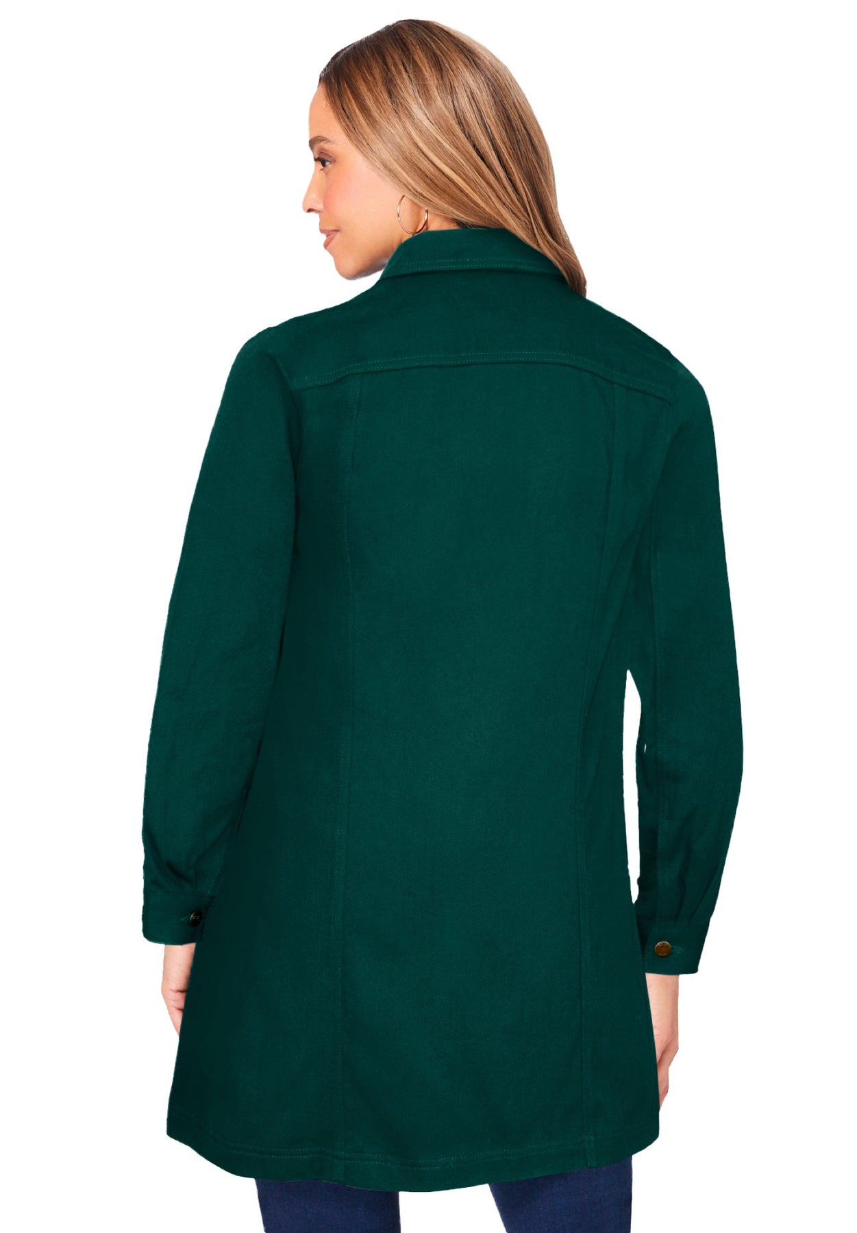 The Jessica London plus size women's Classic Cotton Long Denim Jacket is designed in an iconic silhouette that is figure flattering for every body and designed to move with you, wherever you go. Features on-seam front pockets and button cuff sleeves.
