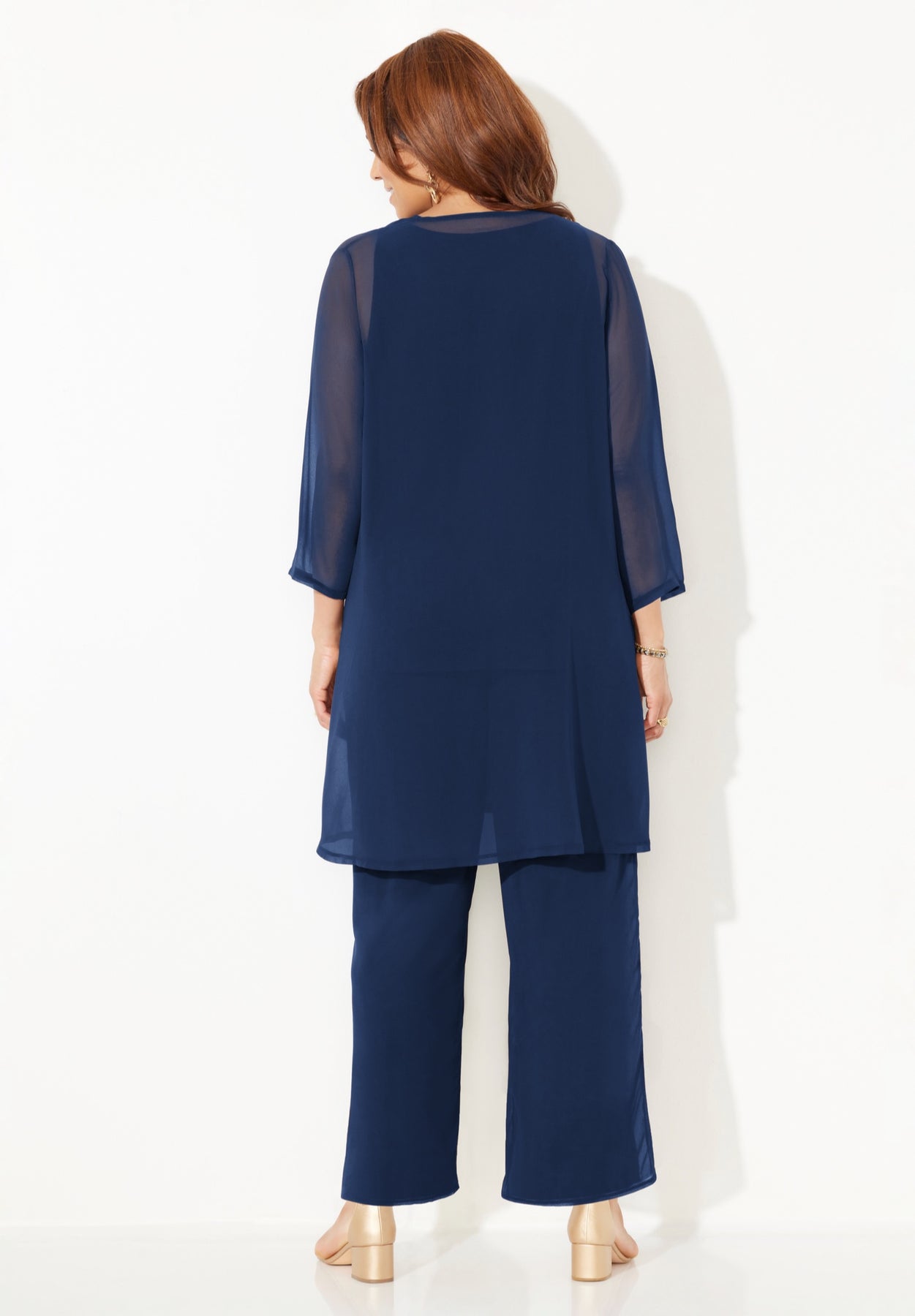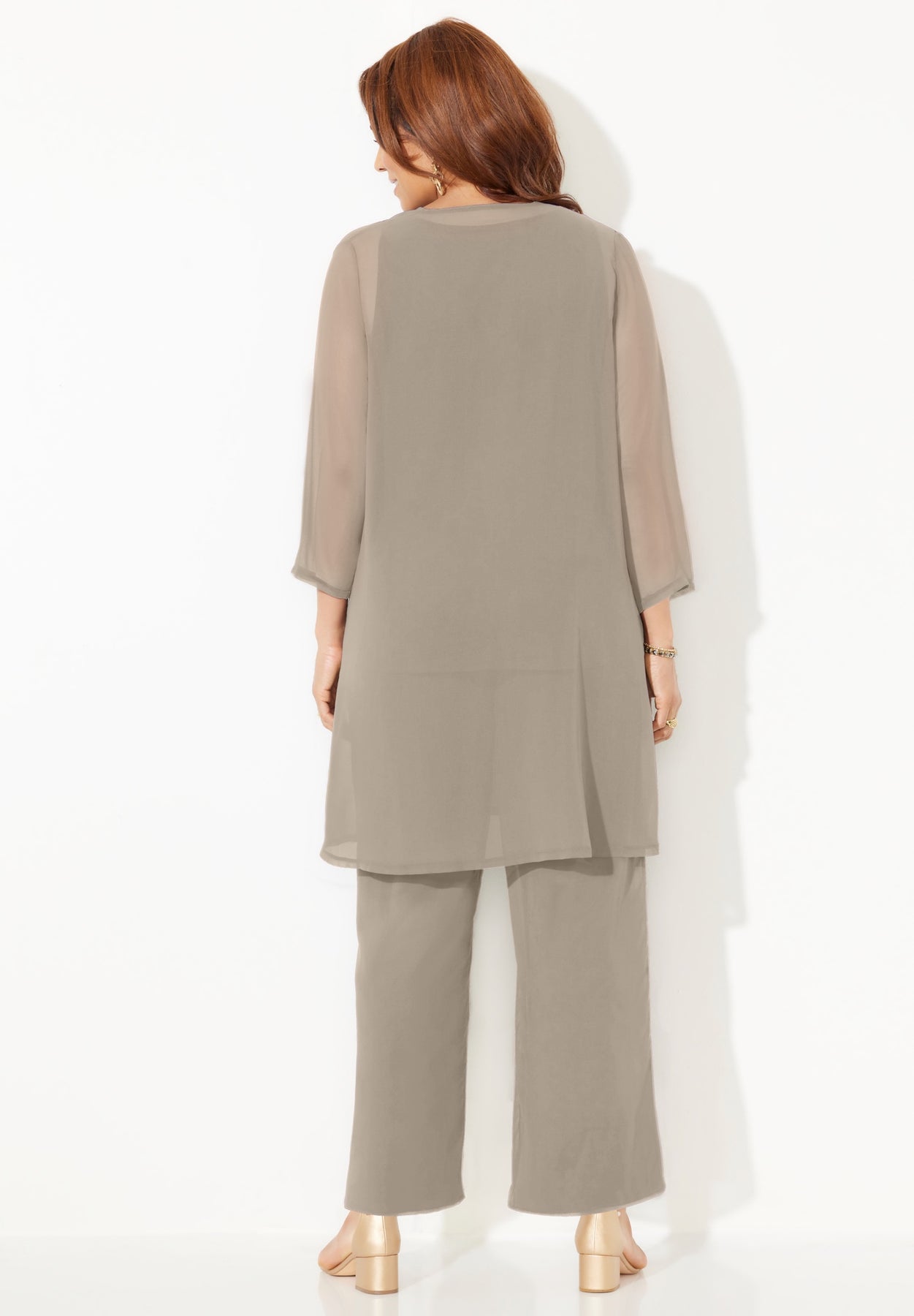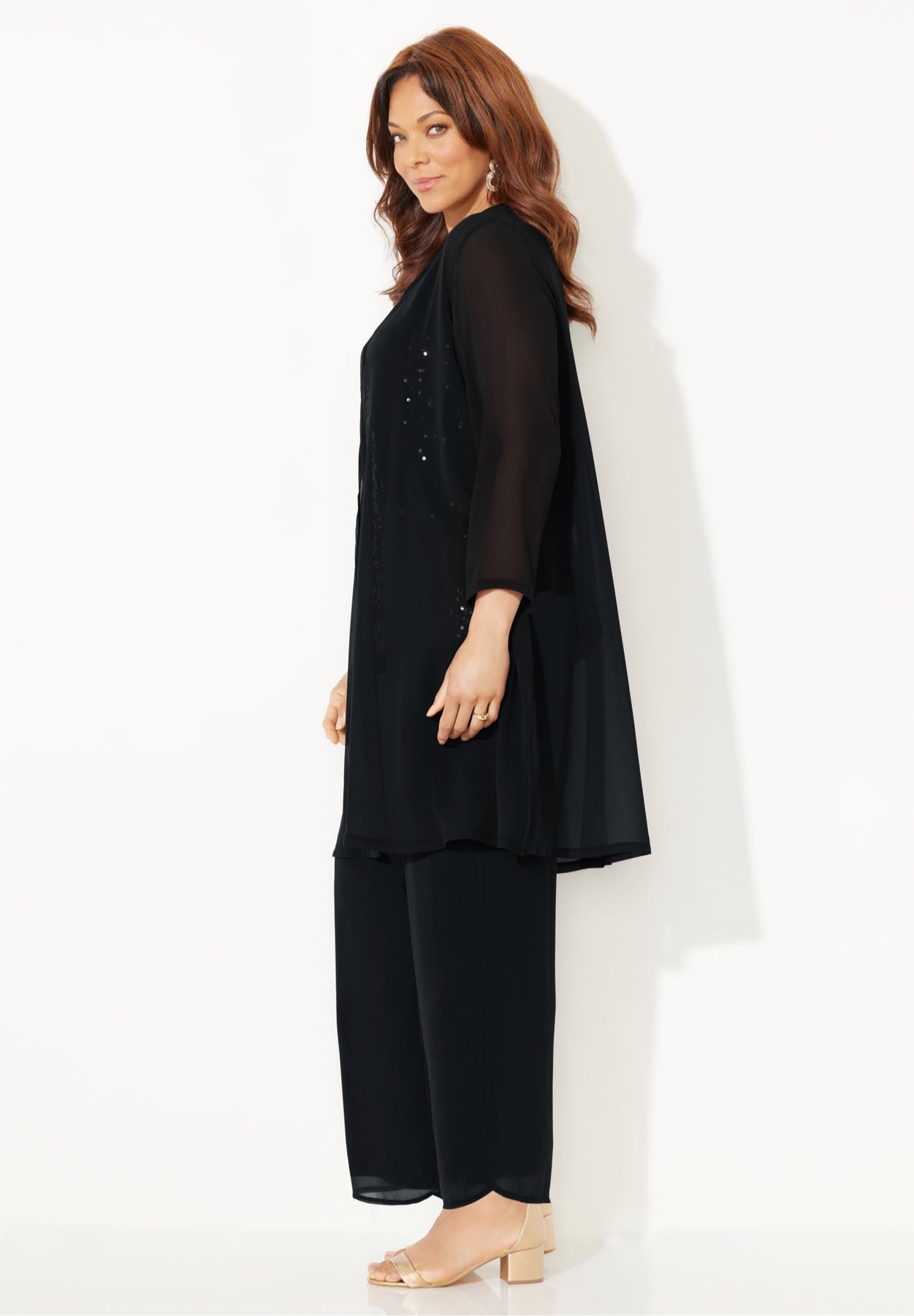 FIT: 3-piece pantsuit designed with an easy fitting sequin tank, layered under a sweeping cardigan - three-quarter length sleeves and side slits on a straight hem. The softly flowing pants complete the look.