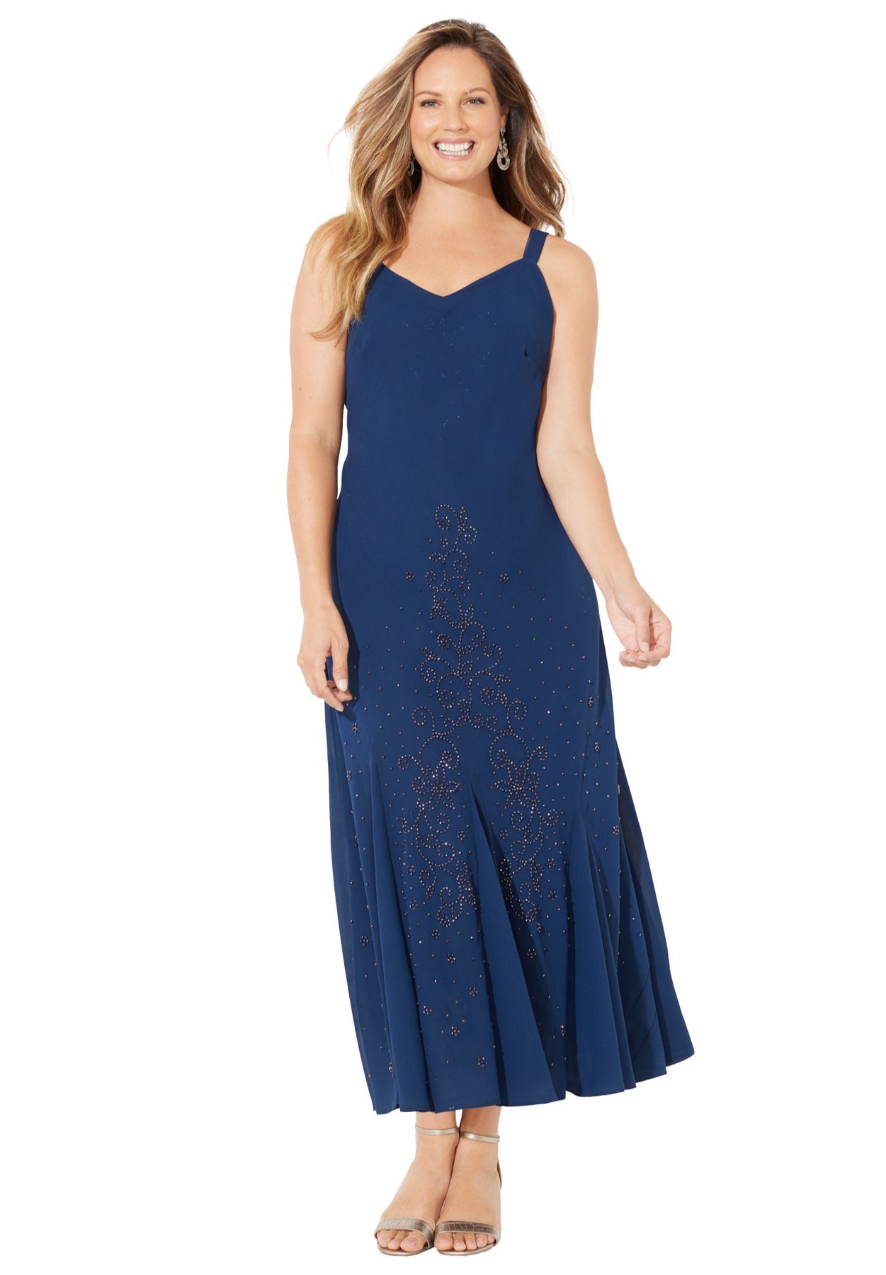 Our gorgeous dress set offers a soft silhouette and unmatched elegance. The tank-style long dress features embellished beading and is topped with a matching sheer jacket that creates a flowy finish.