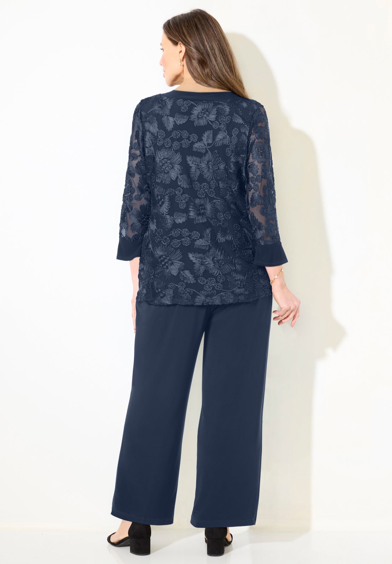This embroidered two-piece suit combines effortless sophistication with the comfort of stretch. You’ll feel pretty and confident in the beautiful soutache-embroidered top with contrast accents at the neck and bracelet-length sleeve hem. Paired with elastic waist pants, it’s a stylish (and comfortable!) choice for weddings, cruises, and elegant evenings.