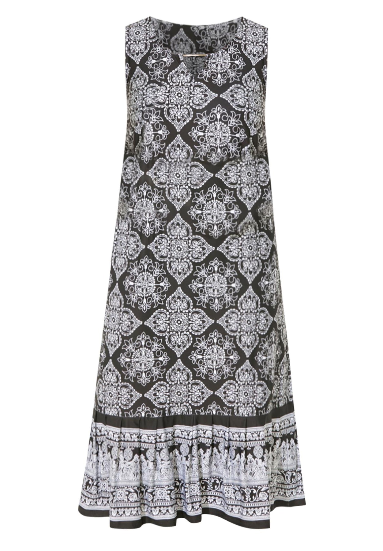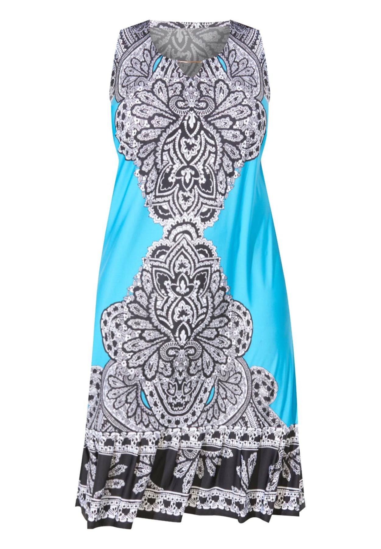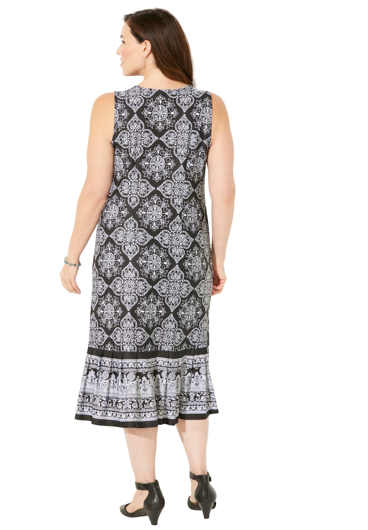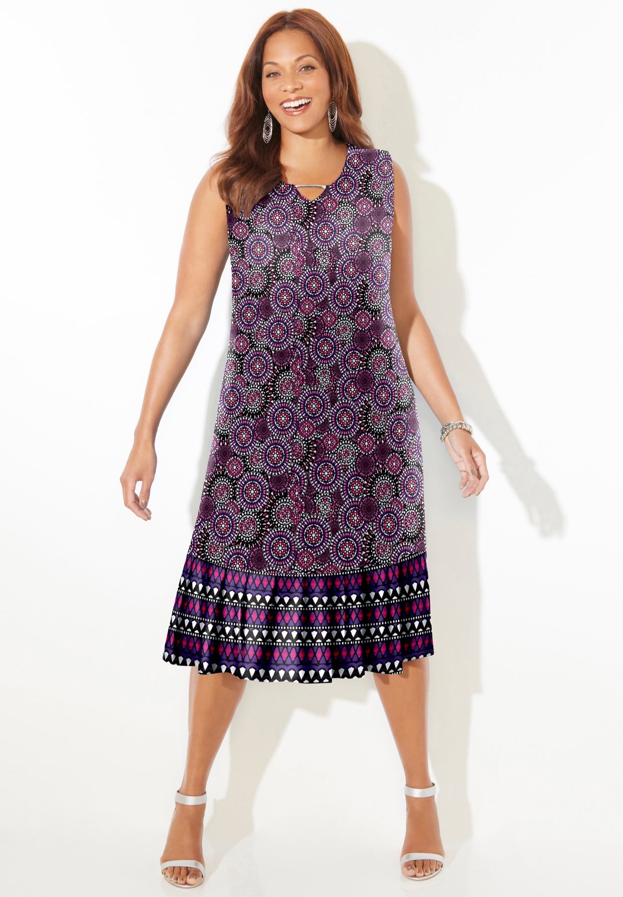FIT: Shift dress silhouette fall straight from shoulder to hem. Sleeveless pullover style. Scoop neckline with flirty keyhole. Bust darts for shaping. 7" flounce at the hem.