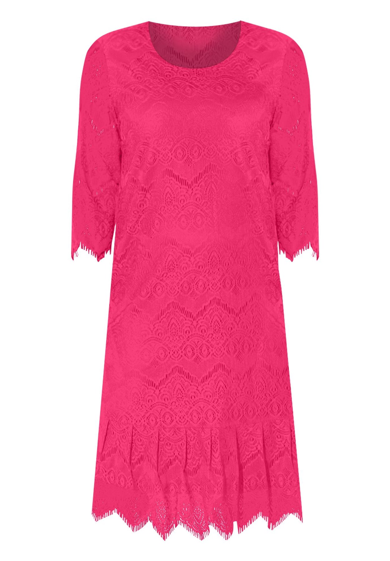 FIT: Relaxed and flattering shift silhouette with scoop neckline and 3/4 sleeves. Bust darts and back waist dart for soft shaping. Center-back zip closure. Flounce hem.