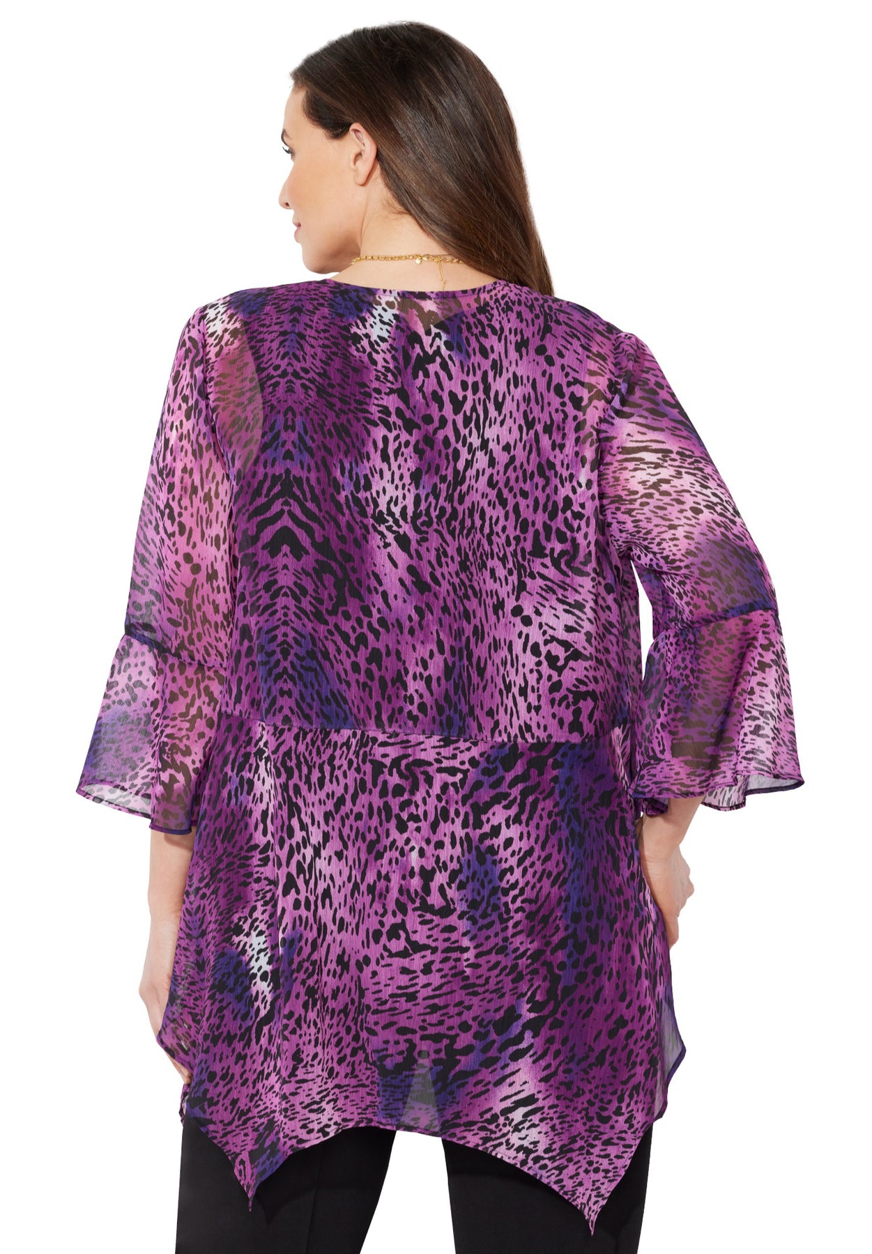 FIT: Relaxed and easy with a soft, flowy look and feel. Bust darts for shaping. Open cascade front. Flounce finish at the 3/4 sleeves and hem.