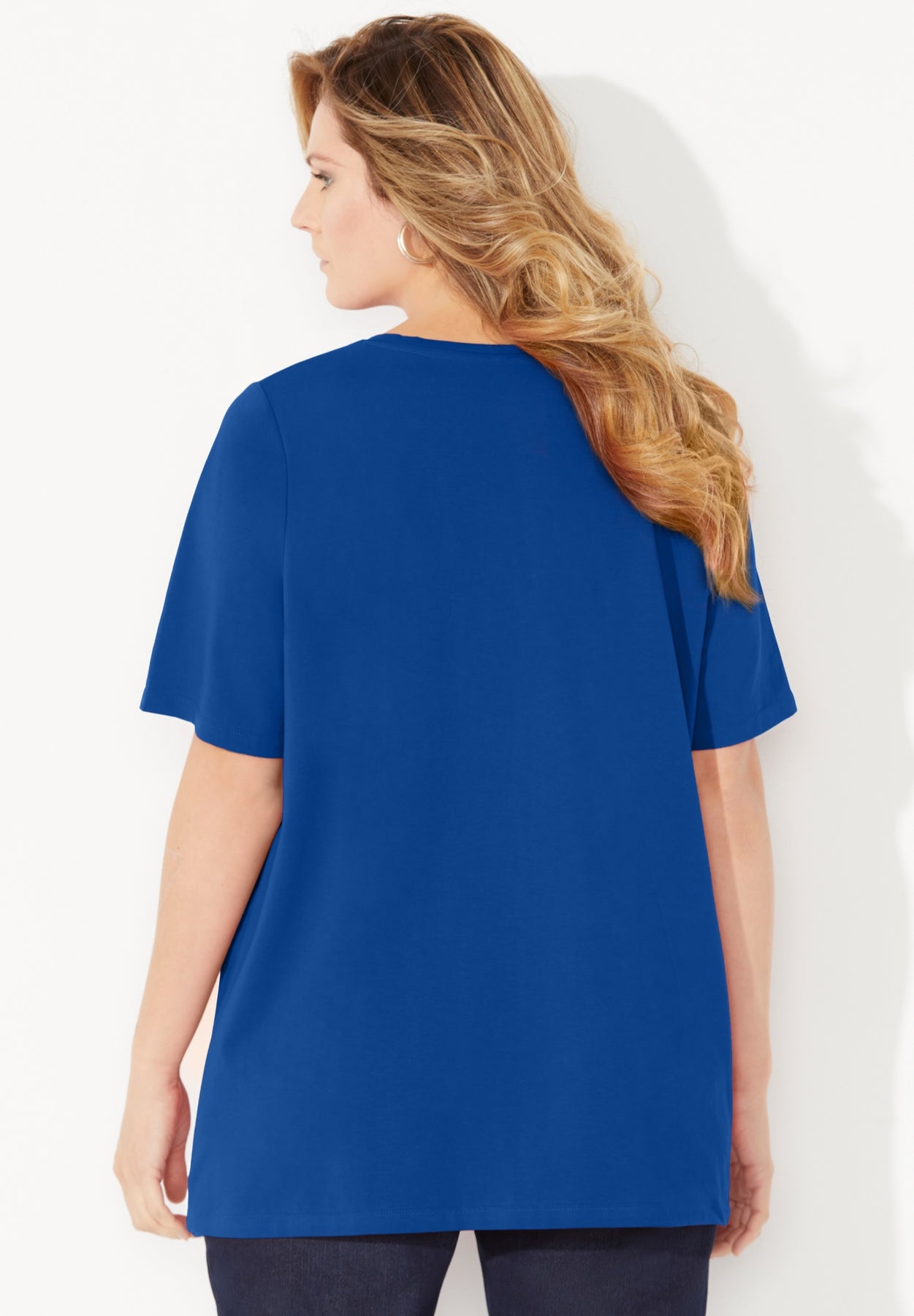 FIT: An easy, comfortable design that skims the body without clinging. Scoop neck with cutout. Short sleeves.