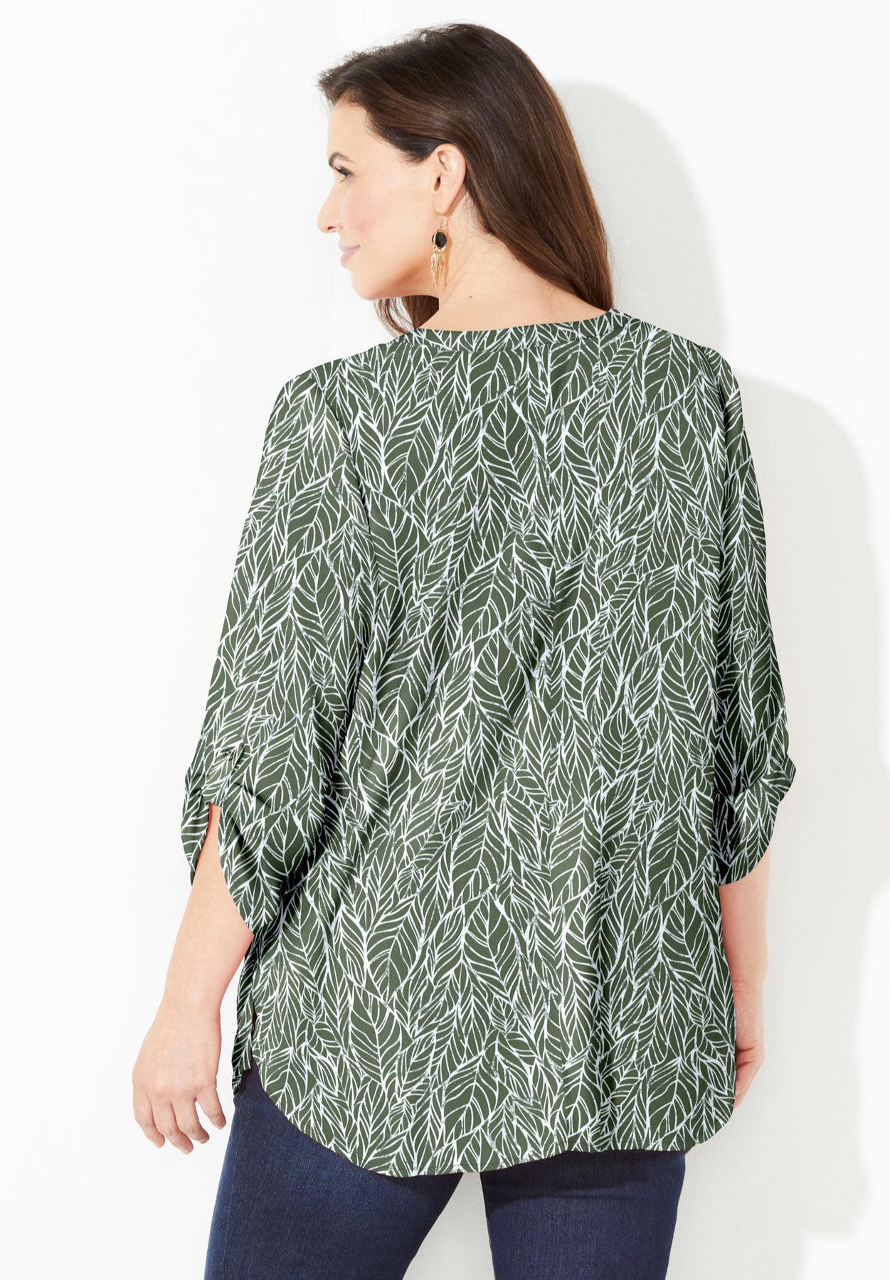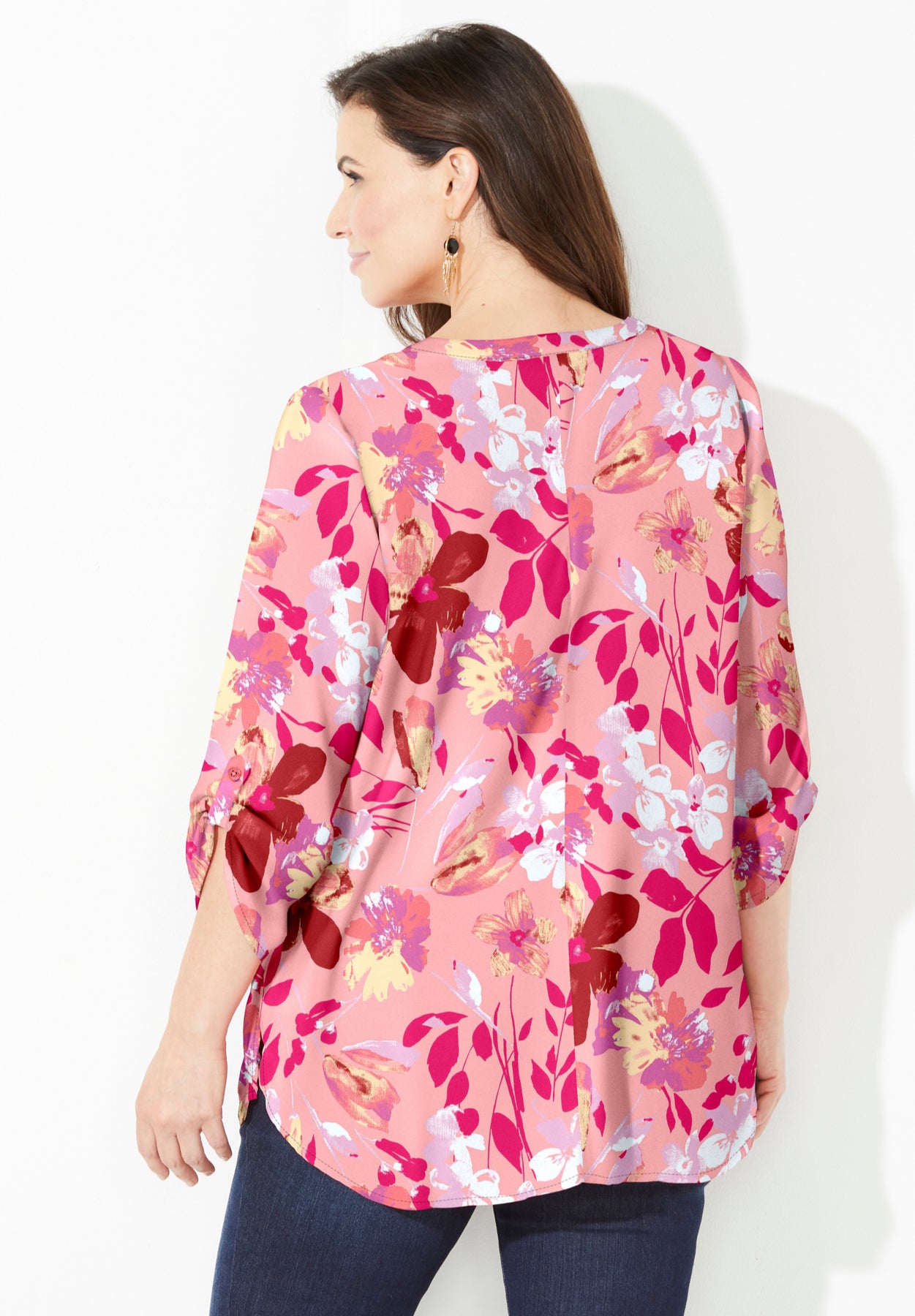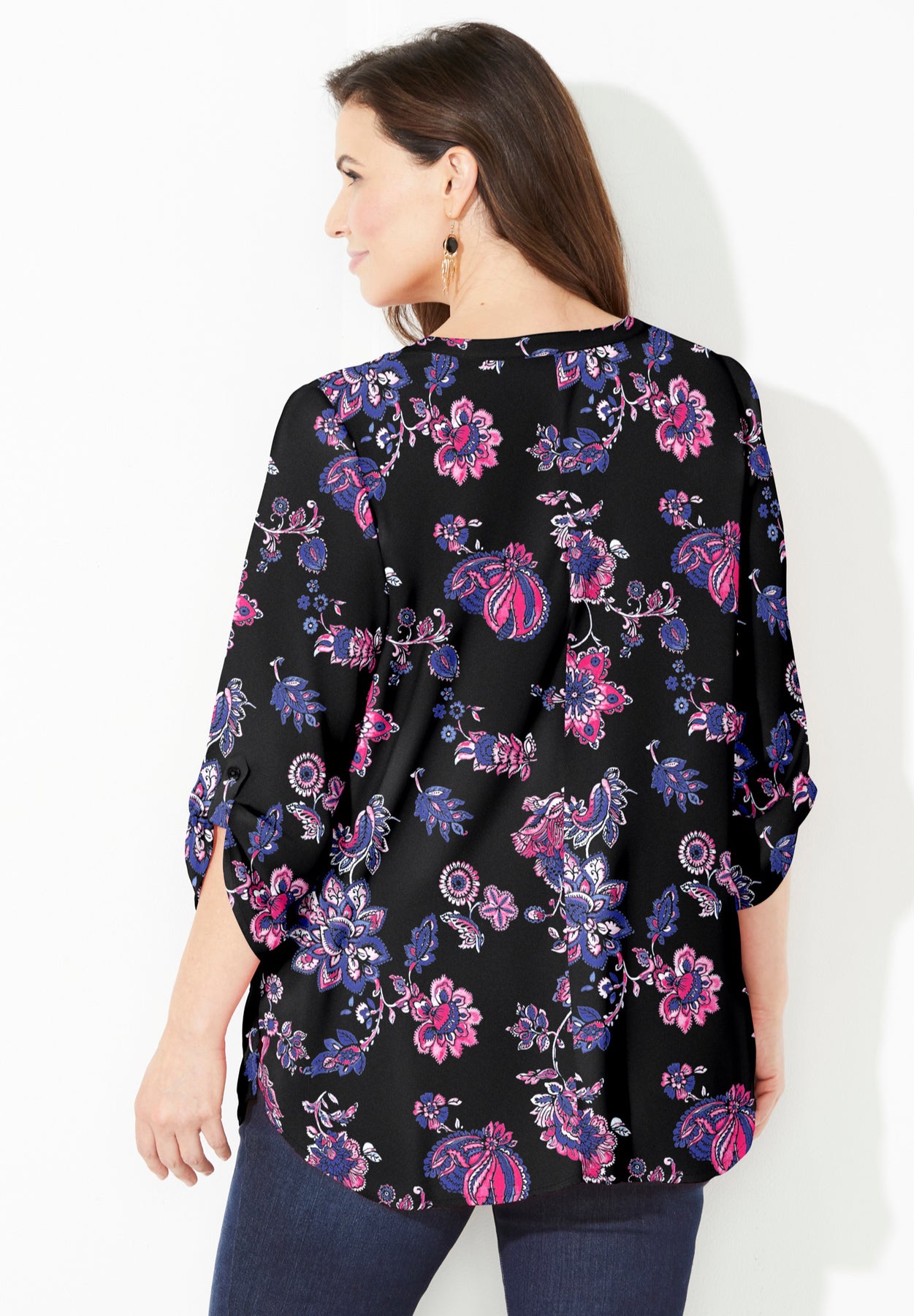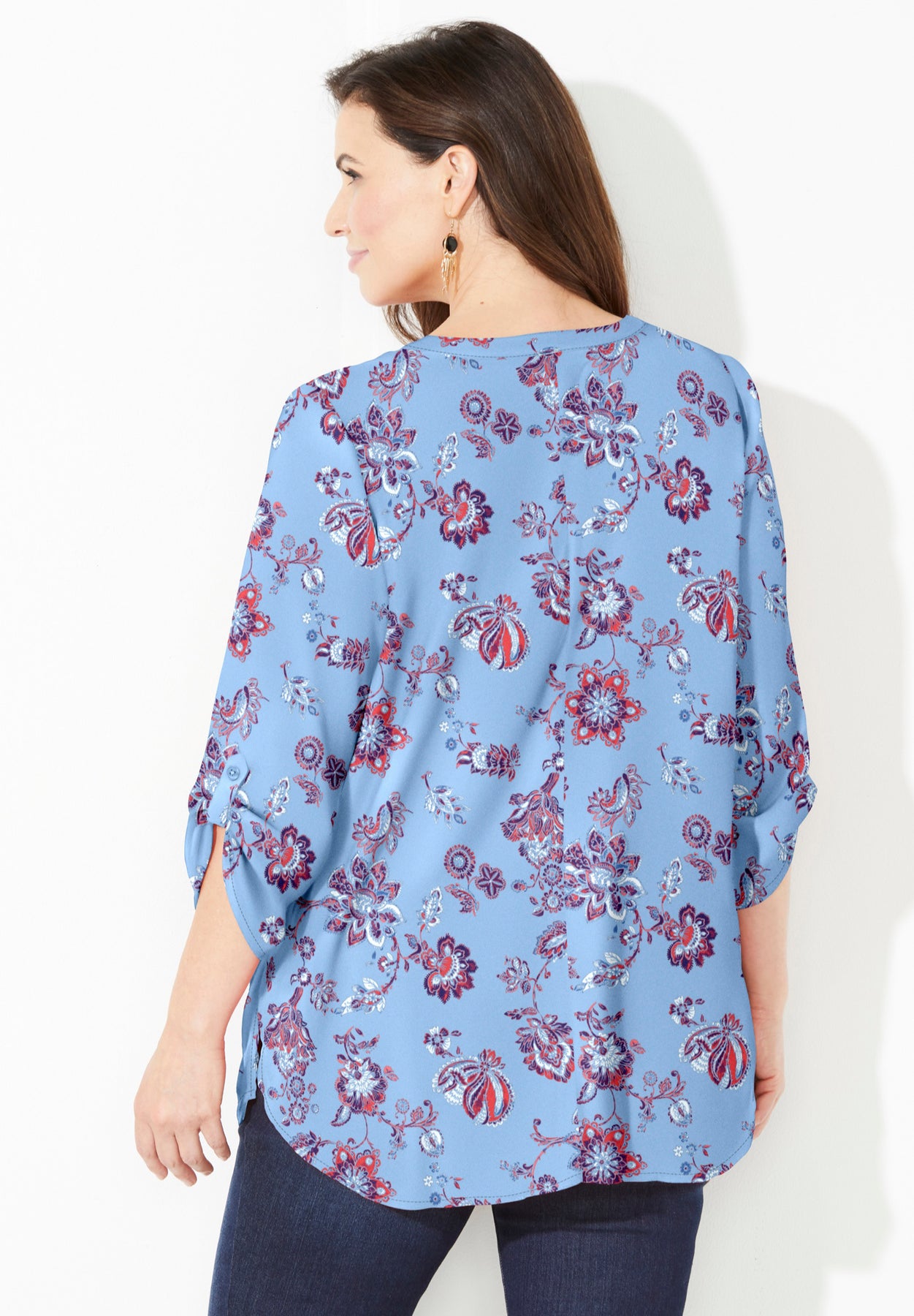 FIT: Relaxed and flowy with classic button front and notch-neckline. 3/4 sleeves with roll-tab cuffs. Side slits. Bust darts provide shape and the perfect fit.