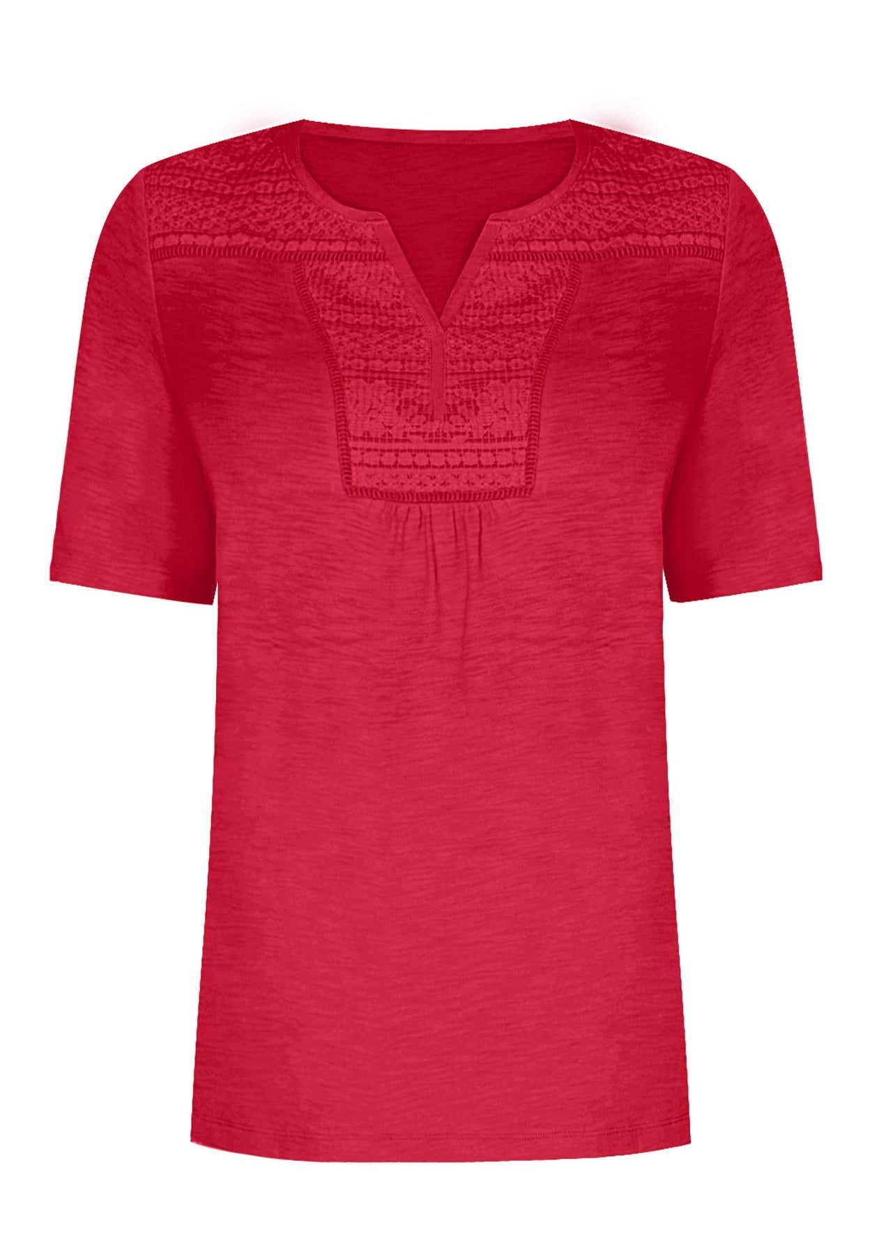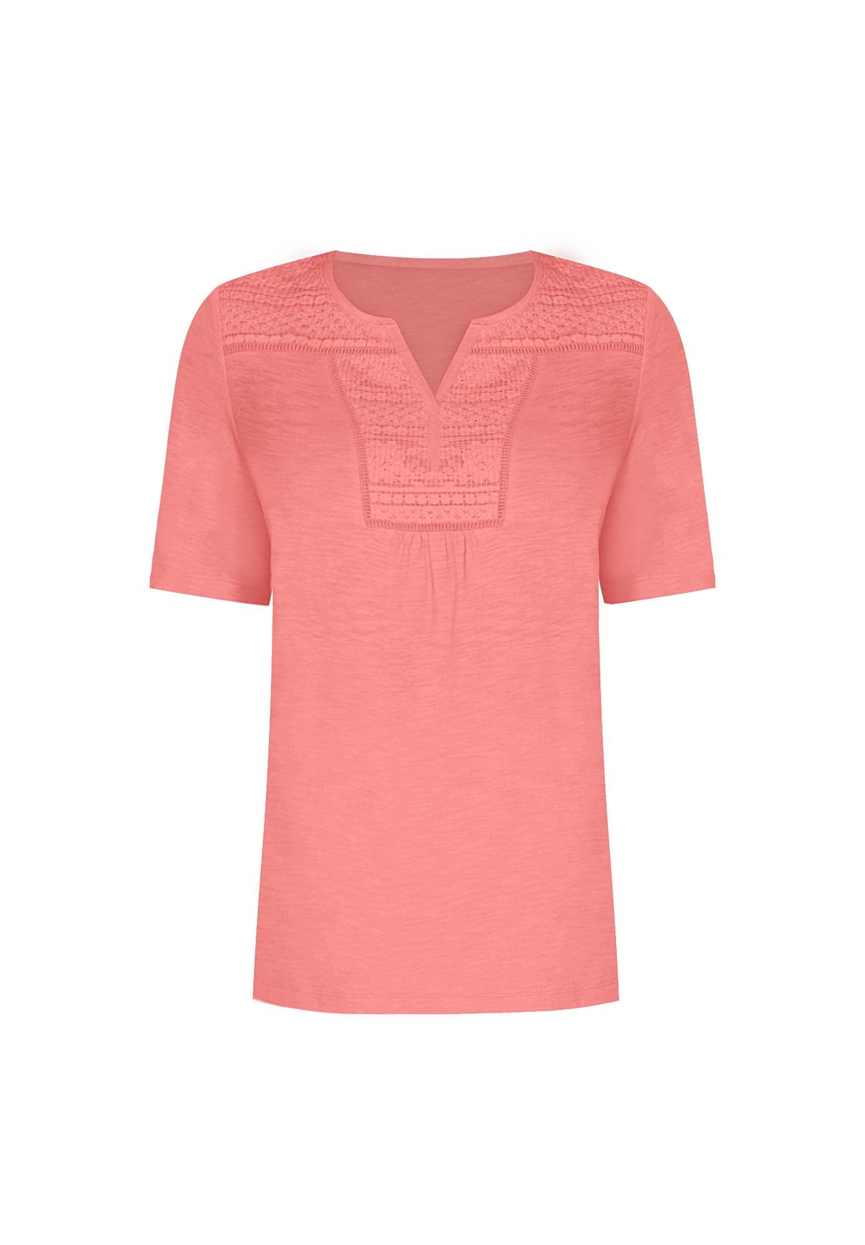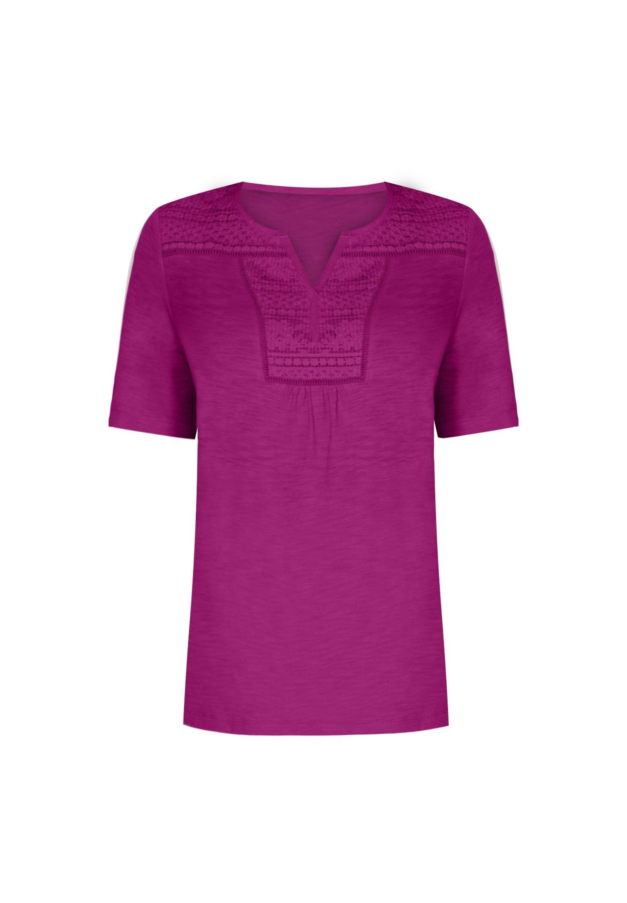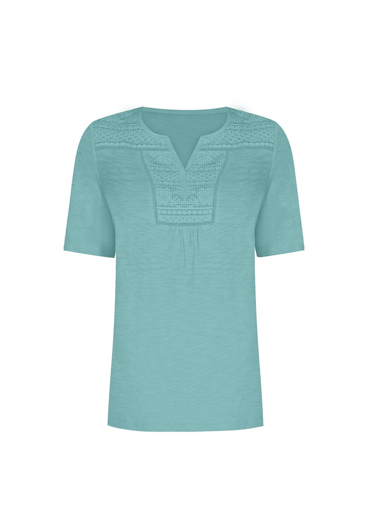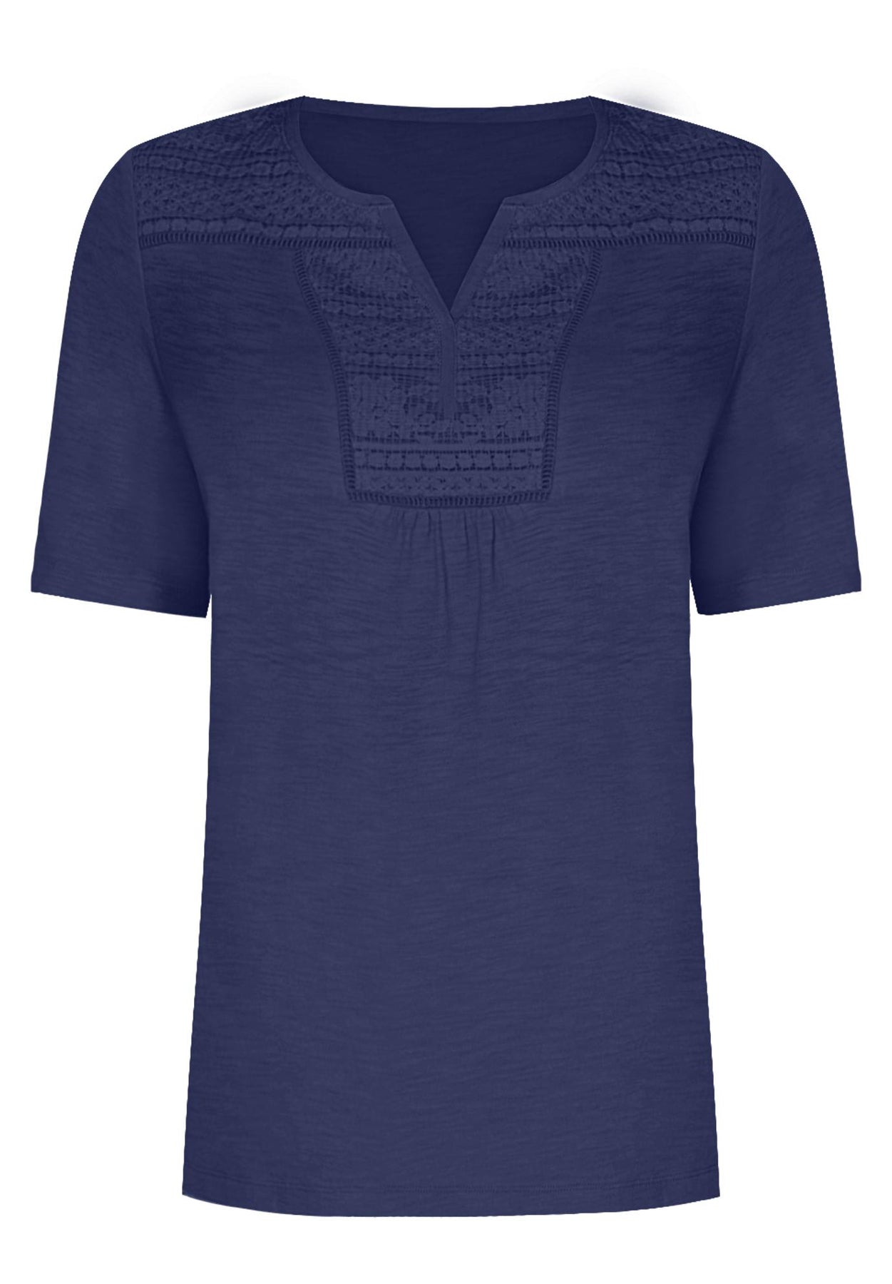 A lace overlay and ladder stitching at the notched neckline add a romantic, feminine touch to this everyday (i.e., perfect) tee.