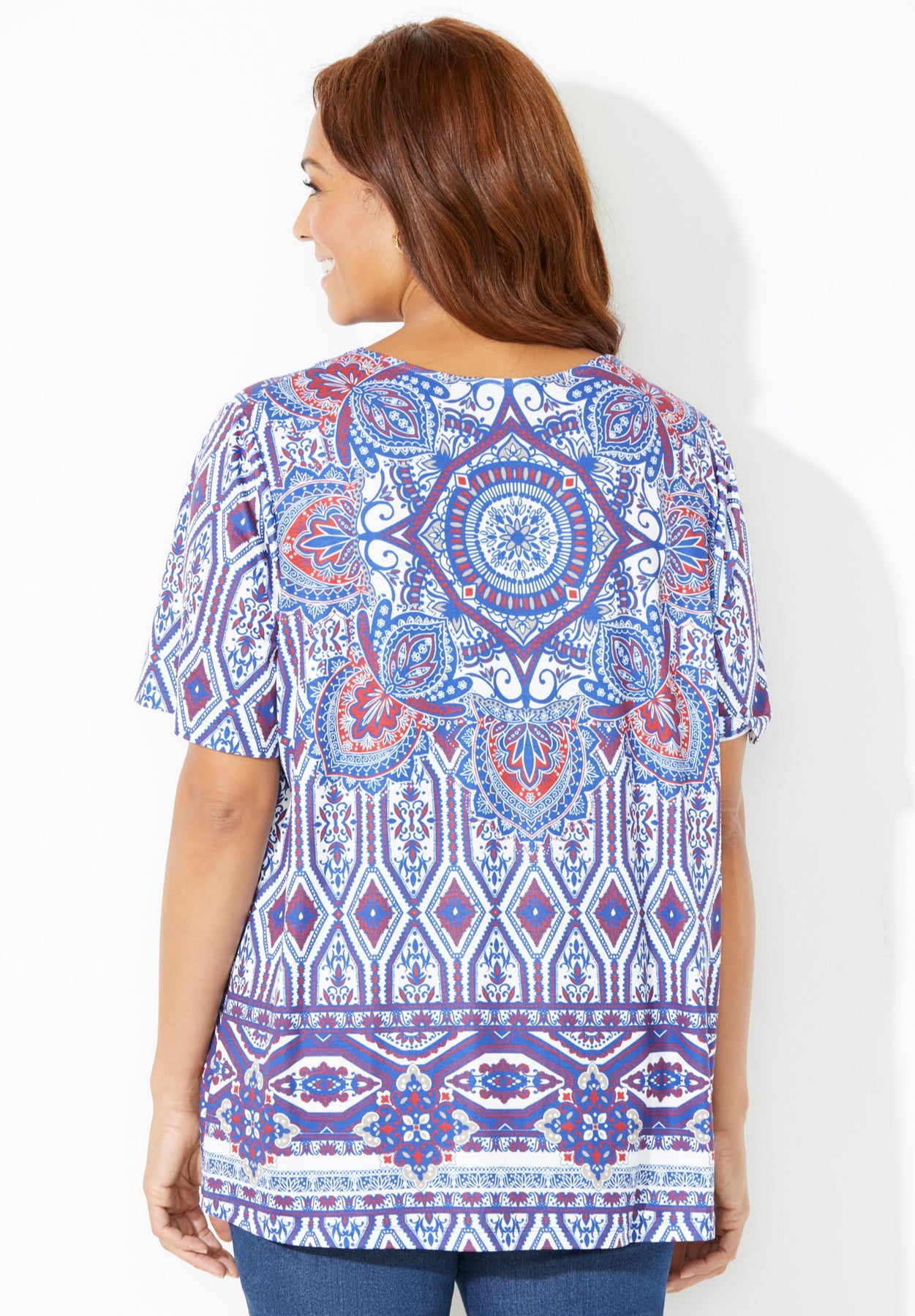 The contrasting print of this top is all about eye-catching style that can have you fashionably dressed for day or night. The neckline is embellished with charming crochet and sparkling studs for extra feminine flair.