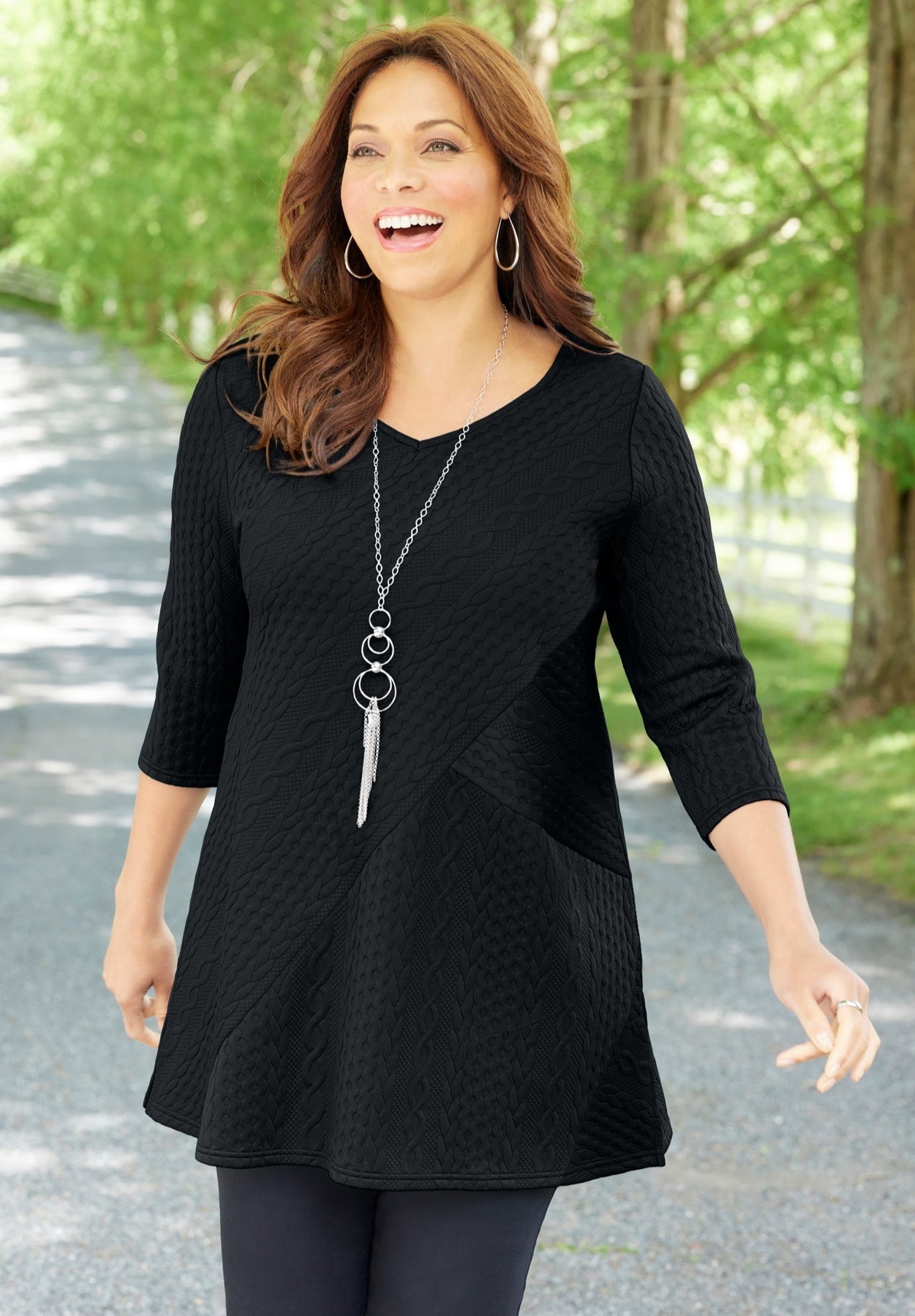 FABRIC: Jacquard knit cable. Soft, stretchy fabric is lightweight, comfortable, and cool to the touch. Skims the body beautifully without clinging.