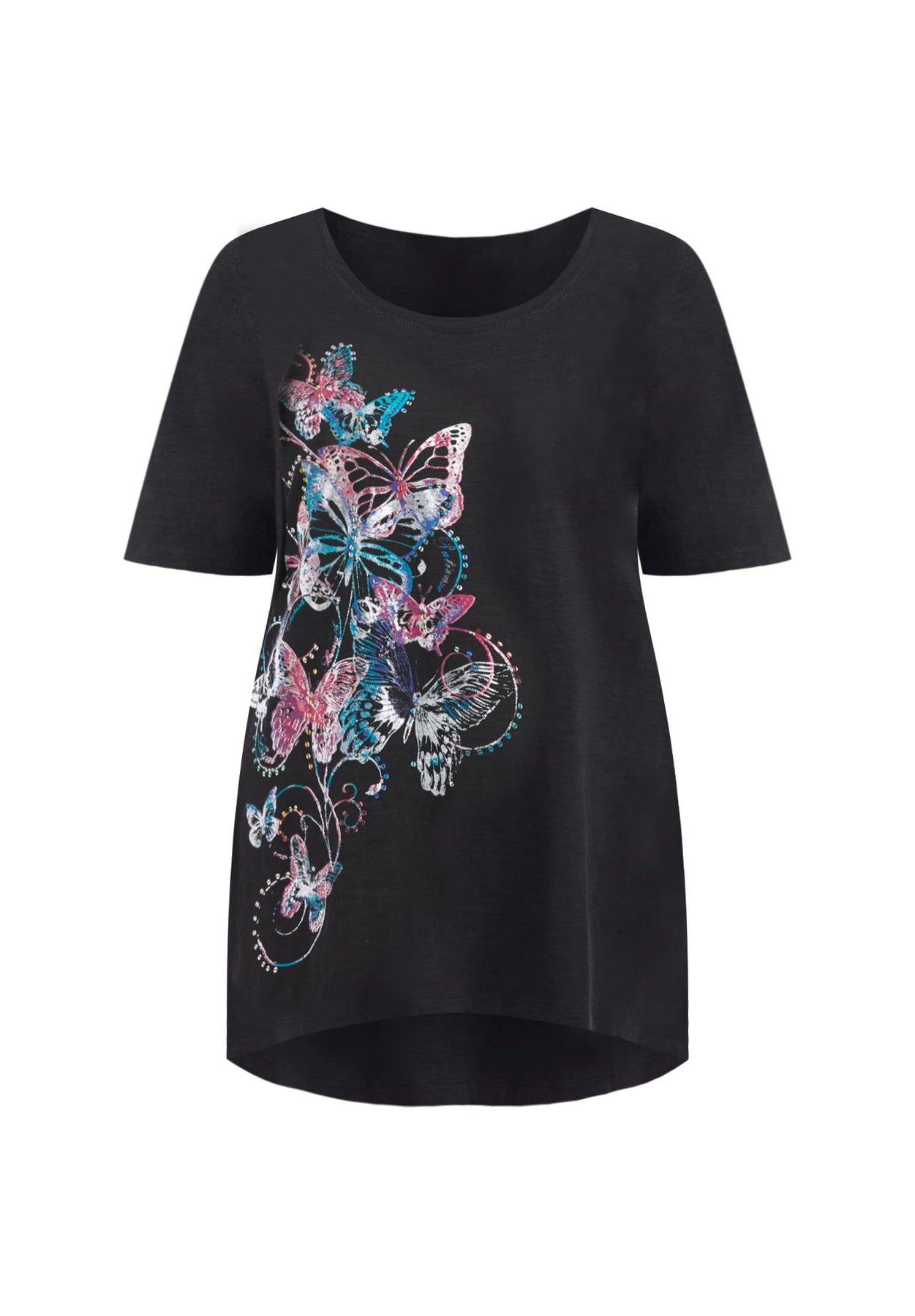 FIT: Relaxed and feminine silhouette with scoop neckline, shorts sleeves and high-low hem.