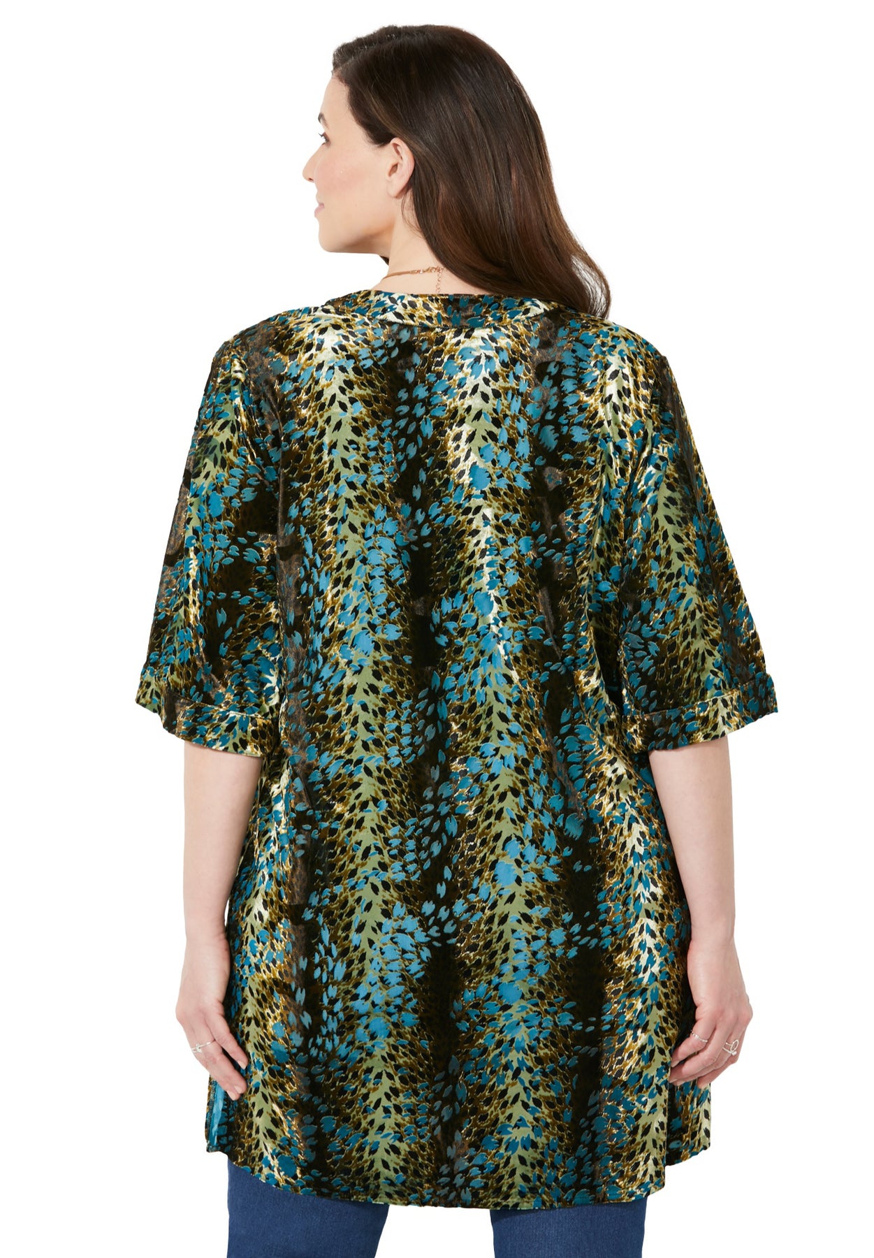 FIT: Lightweight, relaxed and refined. Floats over your curves and finishes every outfit beautifully. Open front. Wide 3/4 kimono sleeves.