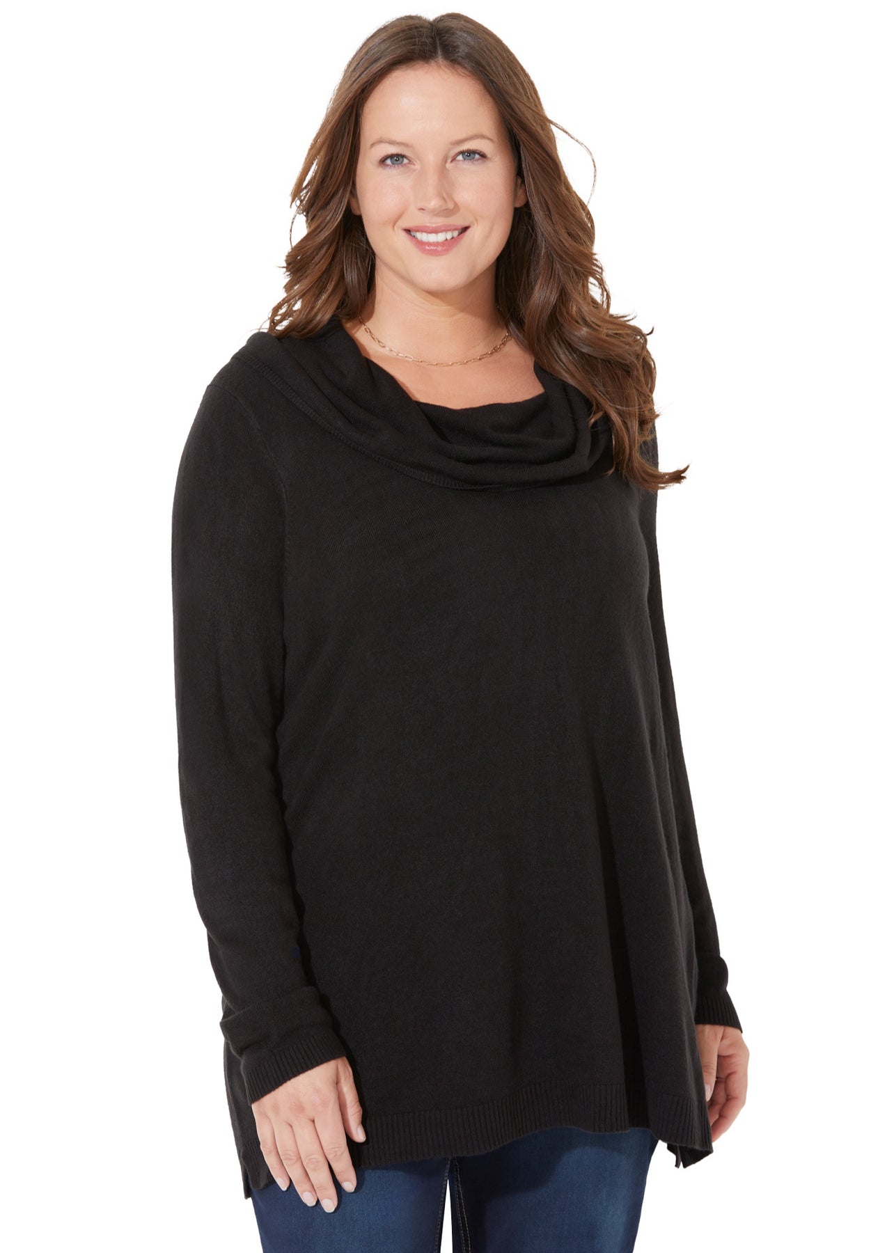 FIT: Feminine and relaxed with a soft, drapey cowl neckline. Long sleeves with rib trim. Side slits for easy movement.
