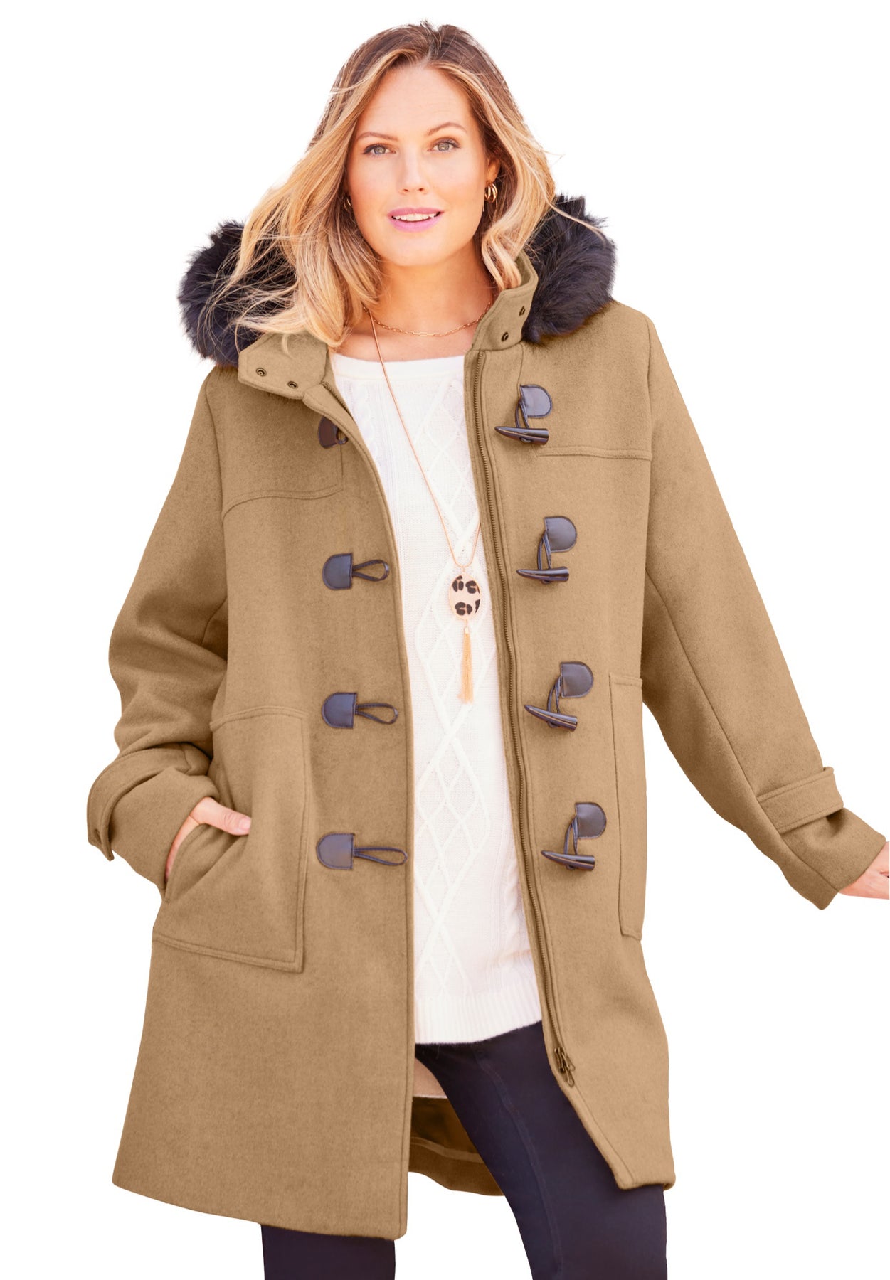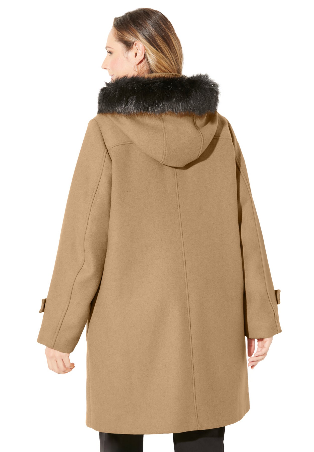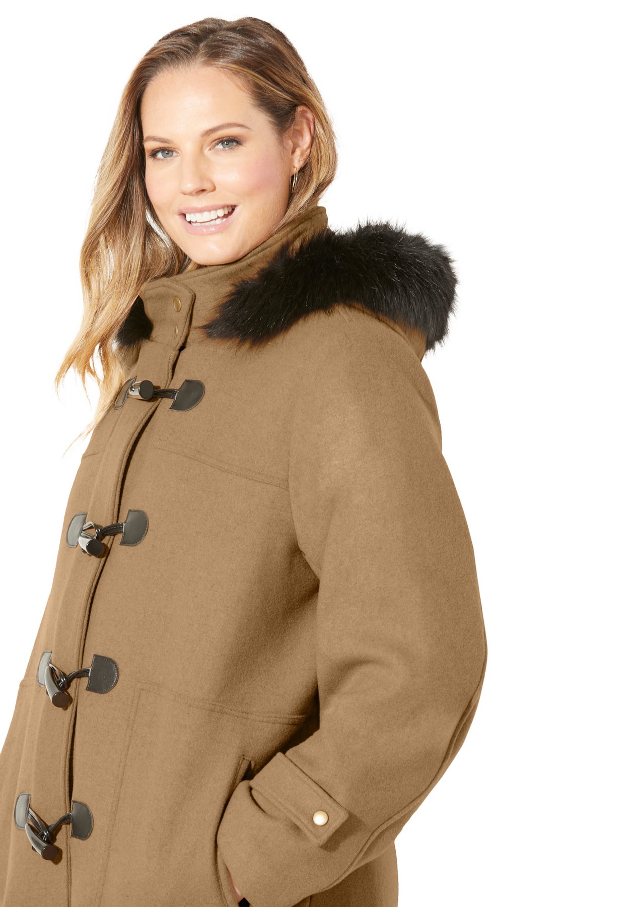 Our timeless toggle peacoat is designed with a faux fur trim hood. The result? Fashion happiness. Feels soft inside, looks stylish outside.