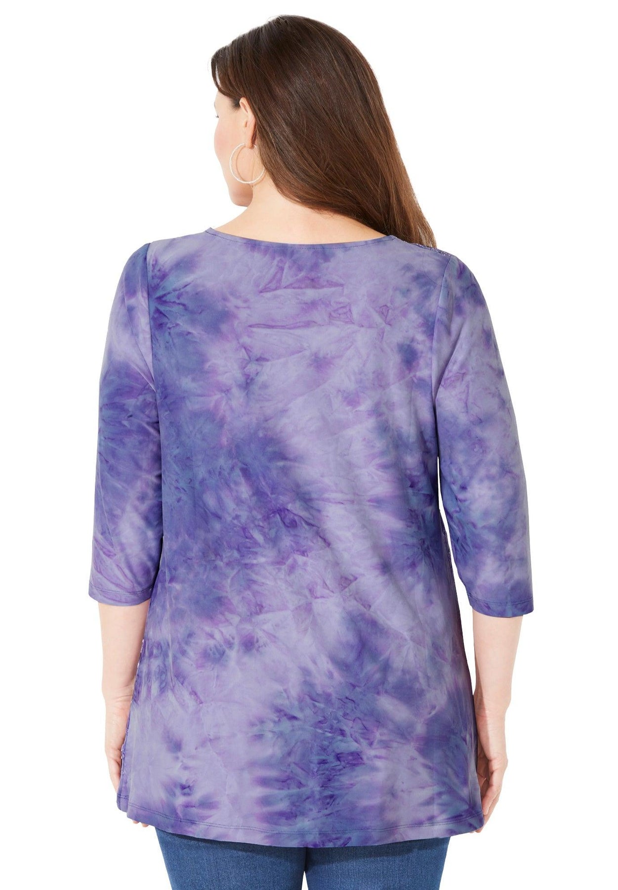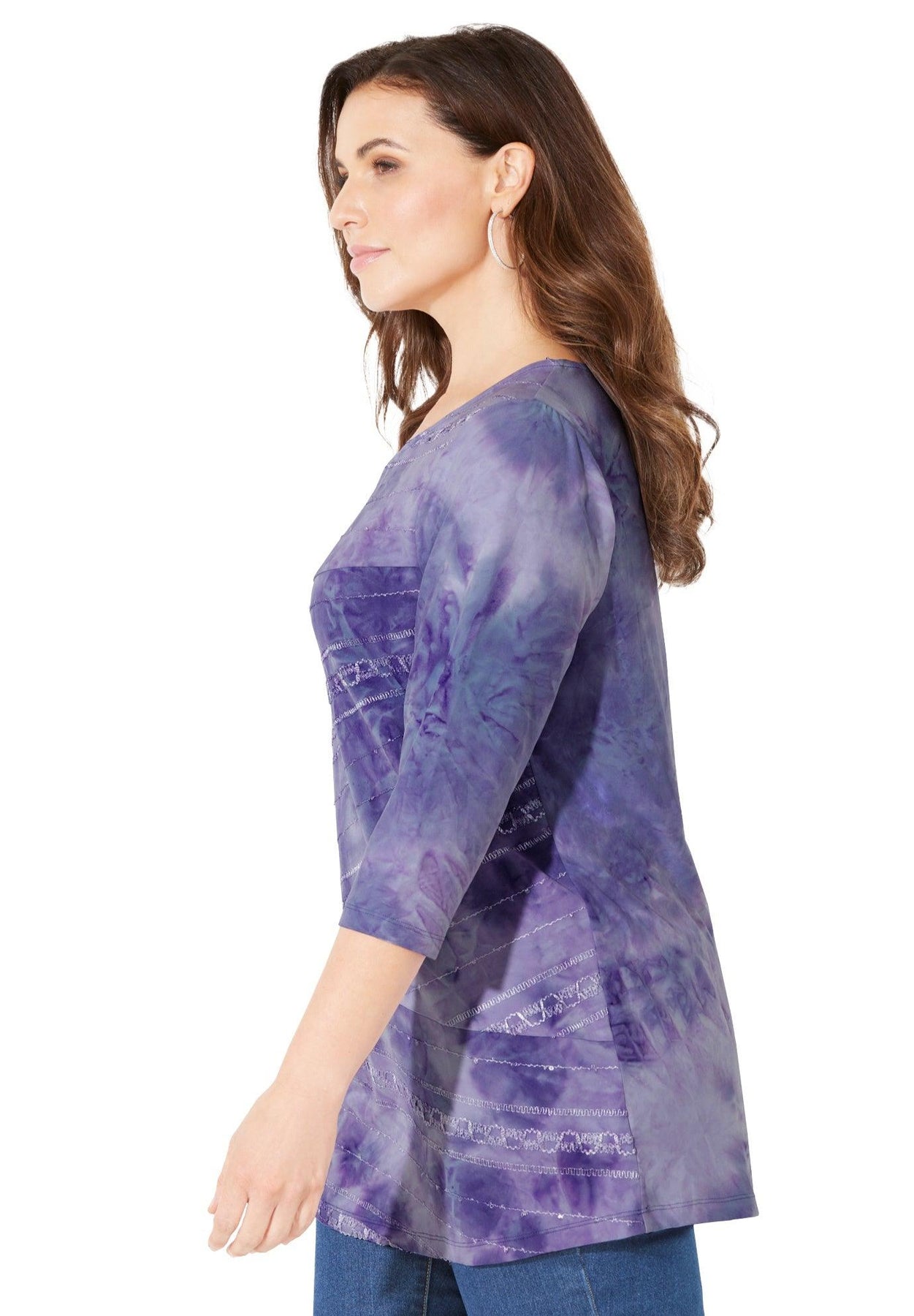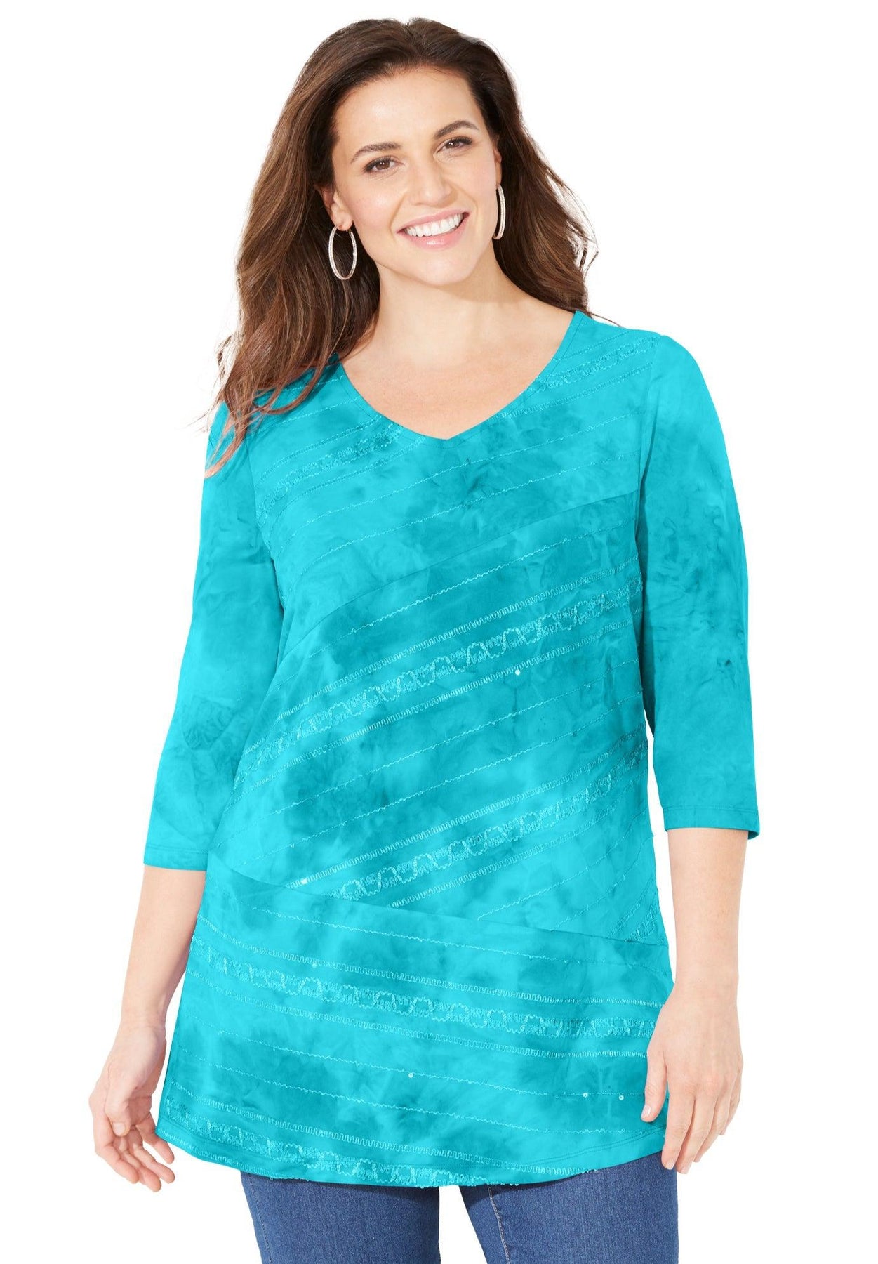 If you want to feel like a million bucks, don’t forget to wear your sequins. Our V-neck top has a fluid, drapey fabric and beautiful tie-dye print for a look you can dress up or down with a refined pant or your favorite jean.
