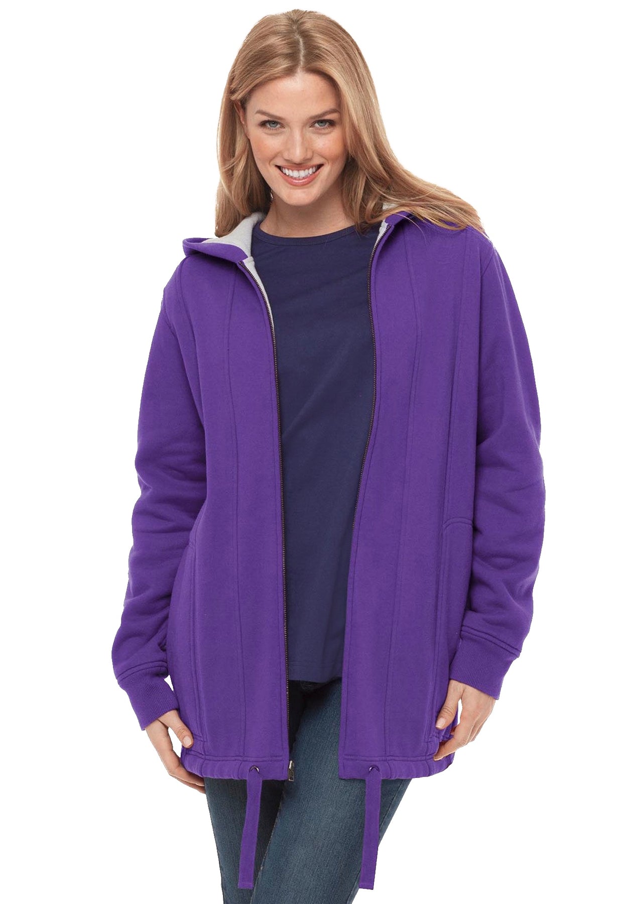 Zip-front jacket fully lined in cotton knit thermal, sleeves lined in cotton jersey. Drawstring hood and rounded pockets.