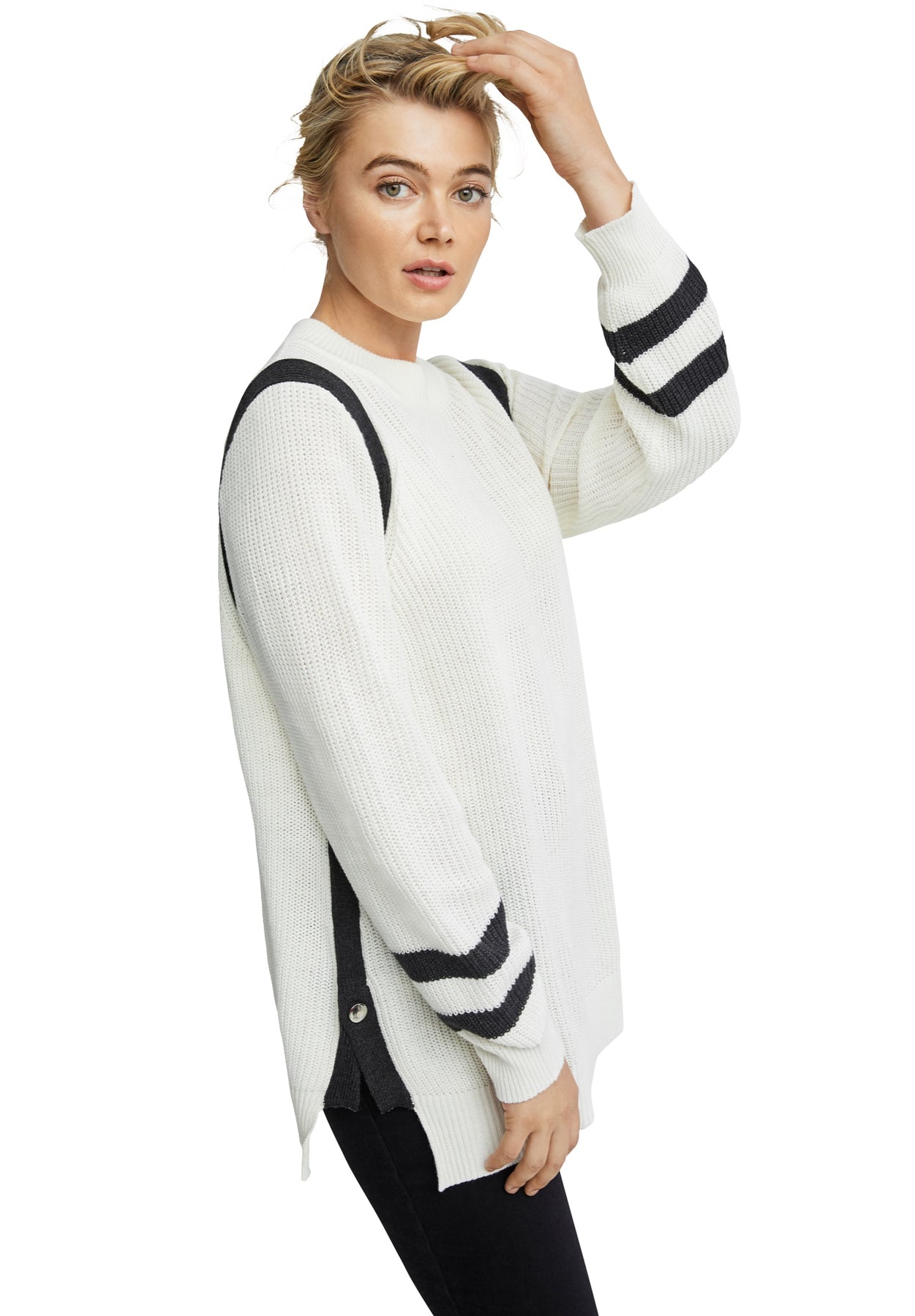 Varsity-inspired contrast stripes trim the edges of this ribbed knit pullover create a sporty-chic look.