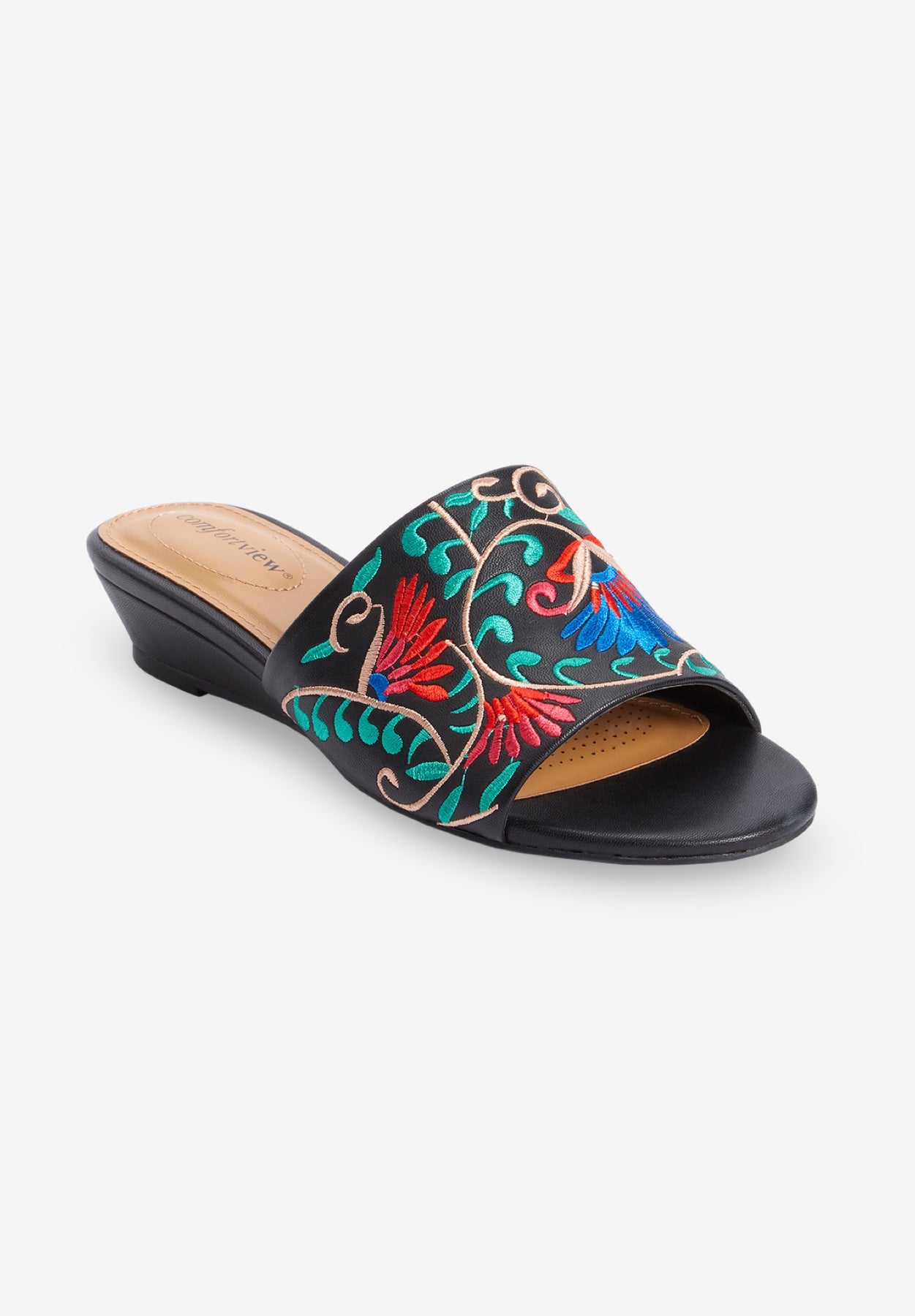 Modern low-wedge mules available in full and half sizes 7-11, 12 M, W, WW