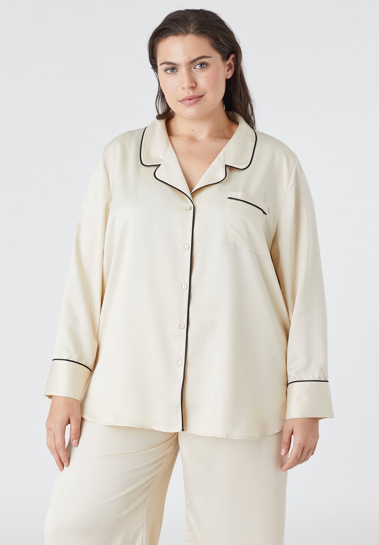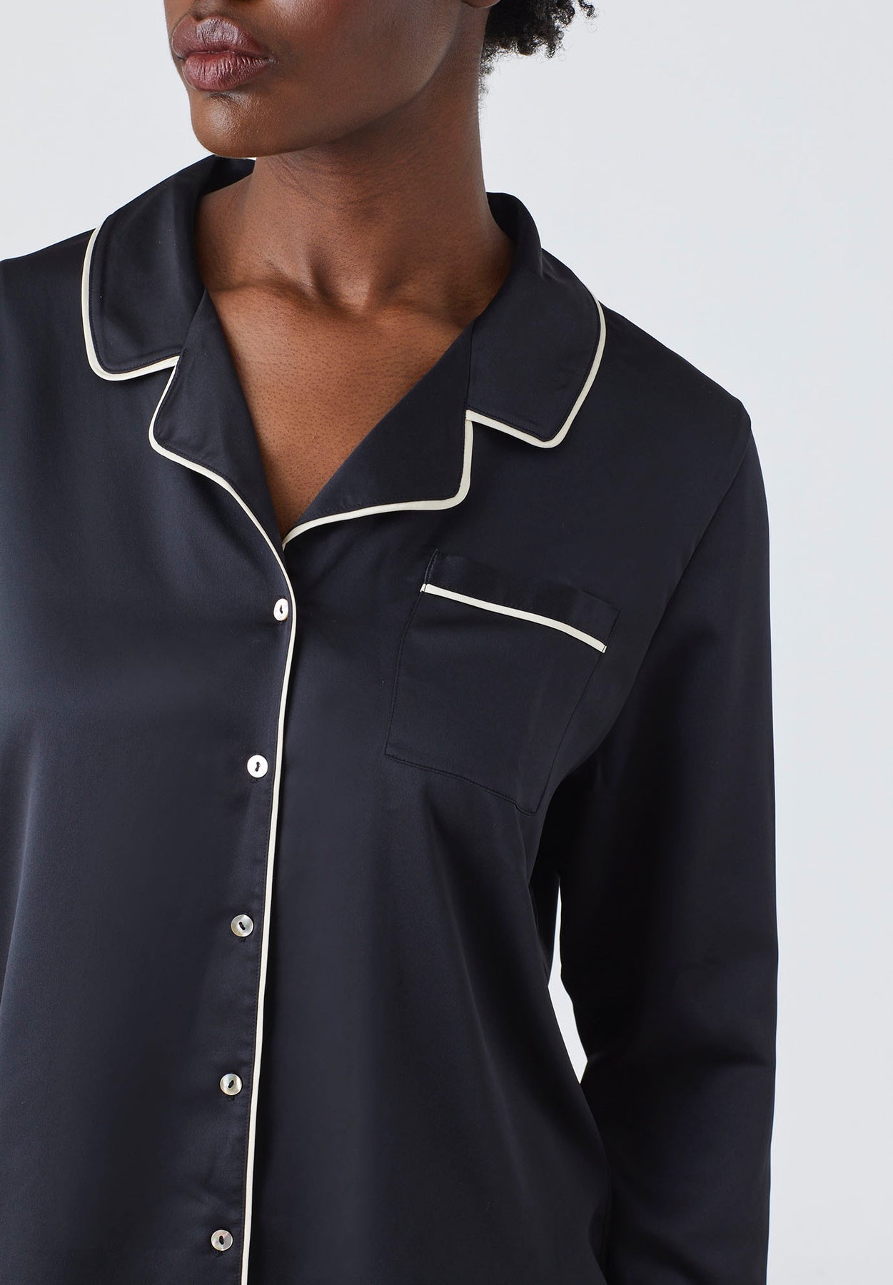 - A stylish pajama set with a relaxed fit, finished with contrast piping and mother-of-pearl buttons