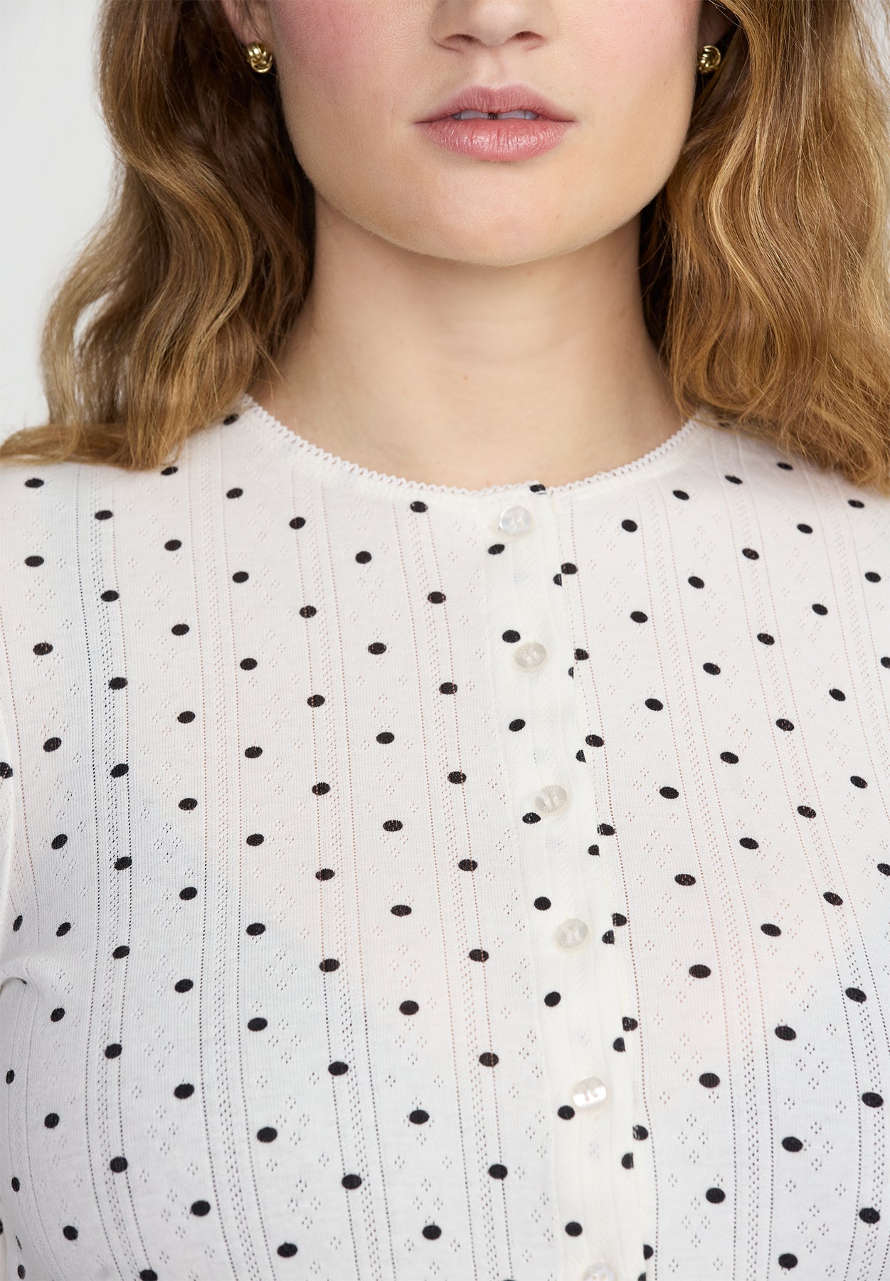 A trend-coded celebration of the cardigan revival, this cropped silhouette comes stitched in our playfully polka-dotted Pointelle fabric. Custom CUUP buttons for added personality.
