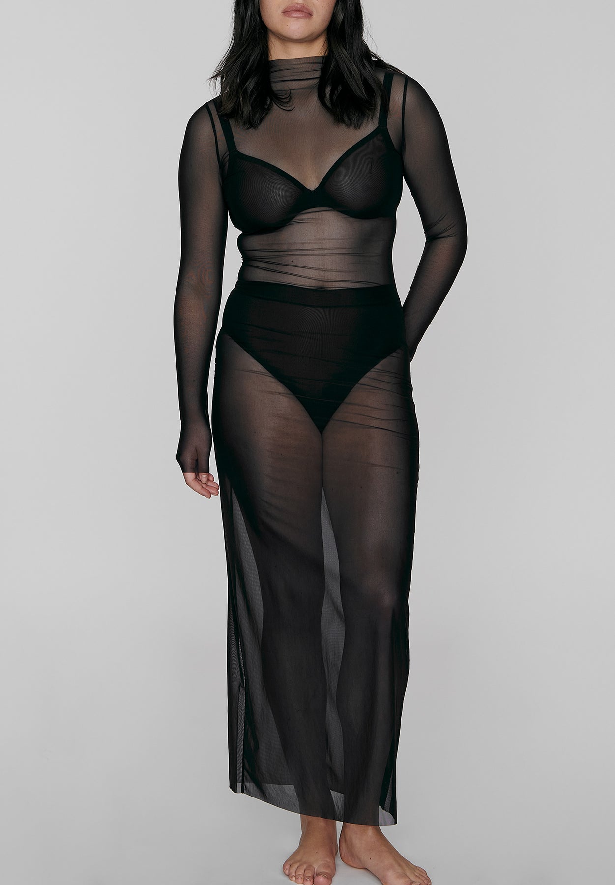 - A sheer dress with a mock neck and long sleeves that create a seamless, minimal effect