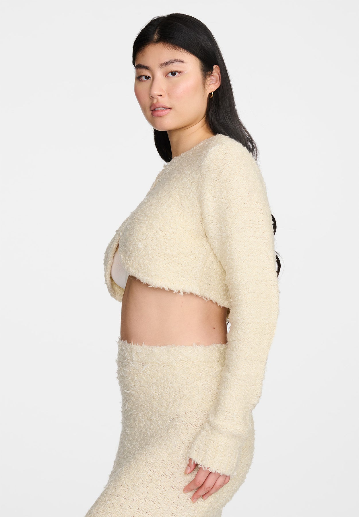 The only silhouette worth layering over a CUUP bra, this bolero-style cardigan features an ultra-cropped, rounded hem designed to complement our bra silhouettes. Try yours with our Balconette & coordinating midi skirt.