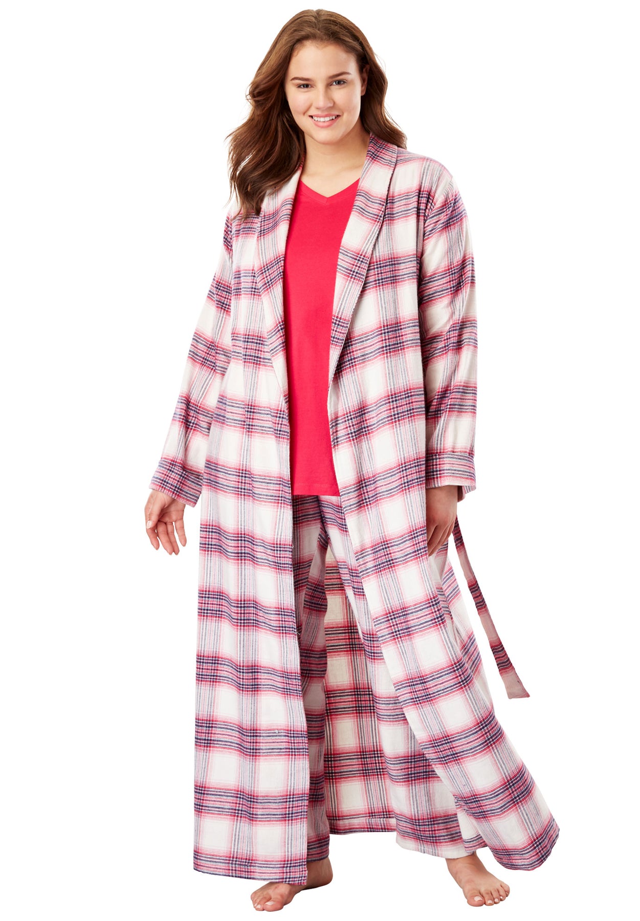 This ultrasoft cotton flannel robe is so cozy you'll never want to take it off. Made with a shawl collar in an extra-long length, it will keep you covered comfortably. A self-tie belt holds it closed.