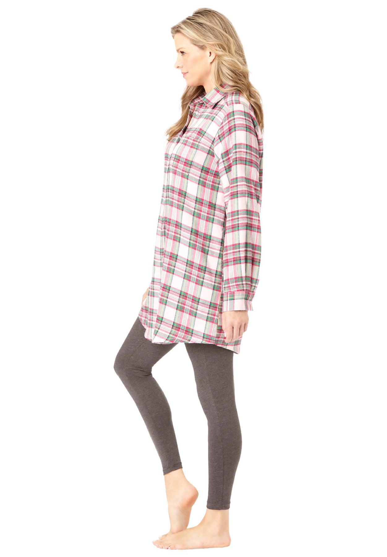 This cozy pajama set pairs a plaid button down tunic with sleek leggings for all-night comfort. Made in a relaxed fit, the sleep shirt has a spread collar and button cuffs along with a chest pocket and shirttail hem just like your favorite button down. Super stretch leggings with an elastic waistband are soft and comfy while you sleep or lounge.