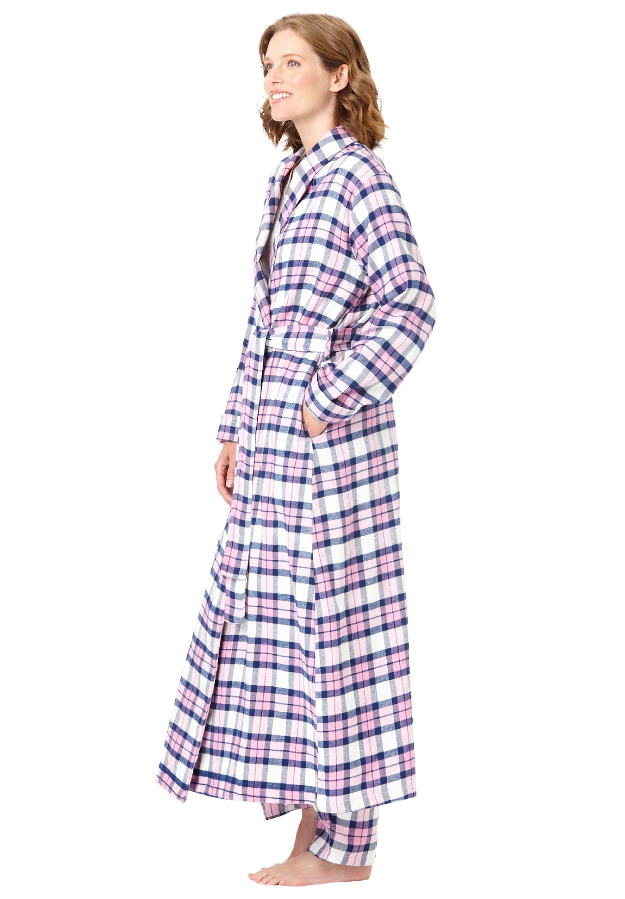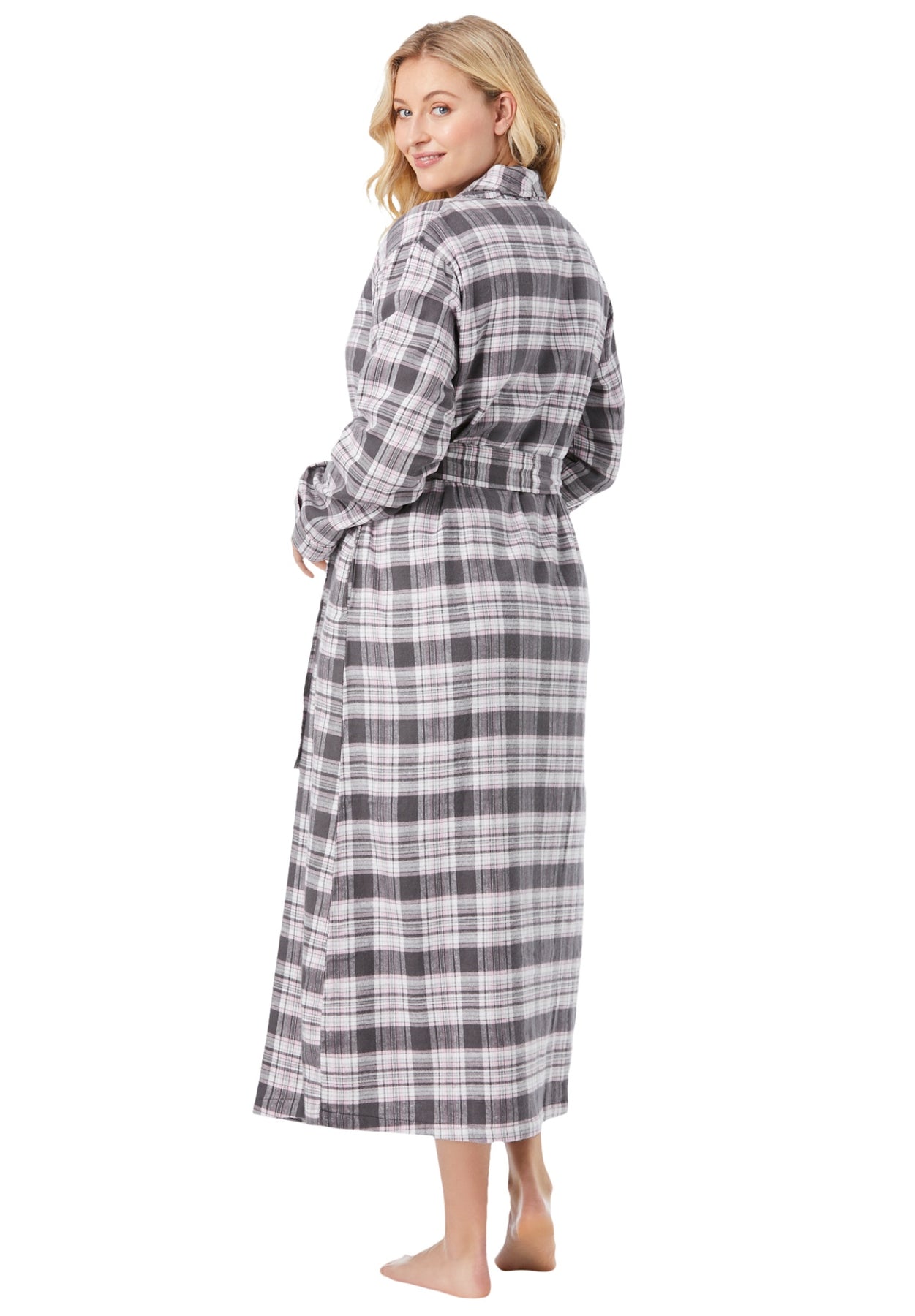 This ultrasoft cotton flannel robe is so cozy you'll never want to take it off. Made with a shawl collar in an extra-long length, it will keep you covered comfortably. A self-tie belt holds it closed.