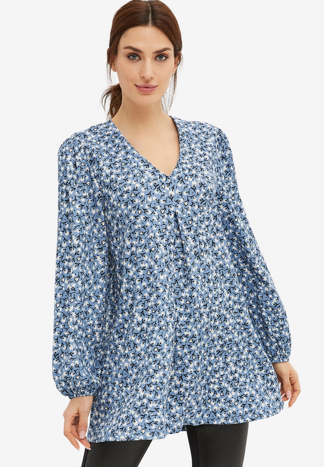 A v-neckline and inverted front pleat gives this flowy stretch-crepe tunic an elongated silhouette. Blouson sleeves to wear long or pushed up add style versatility. Pair this stunner with jeans, trousers or stretch leggings for a winning look.