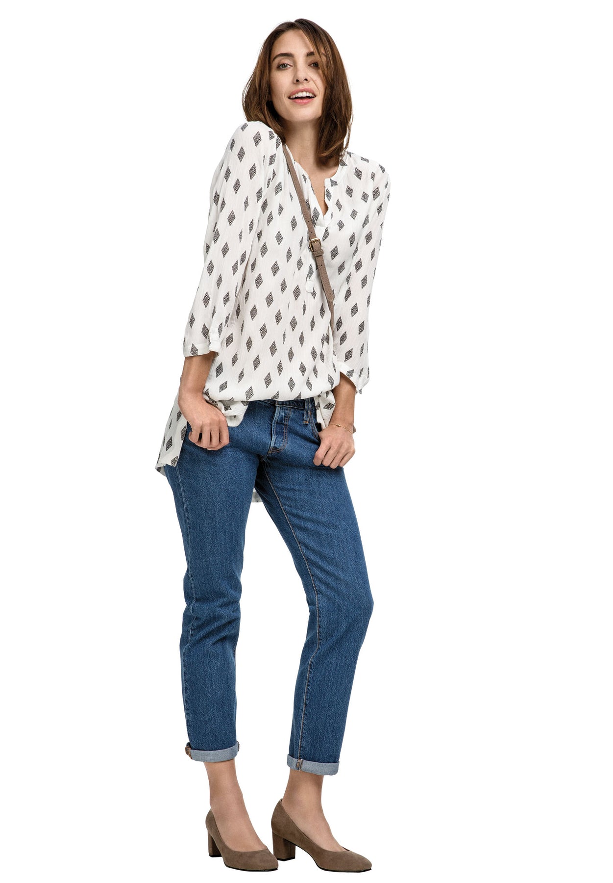 Our effortless tunic is just what you need to lighten up your wardrobe. Details include a relaxed silhouette, notch neckline and 3/4-length sleeves with slits at the sleeve cuffs. This piece will take you from work to play, all with a spring in your step.