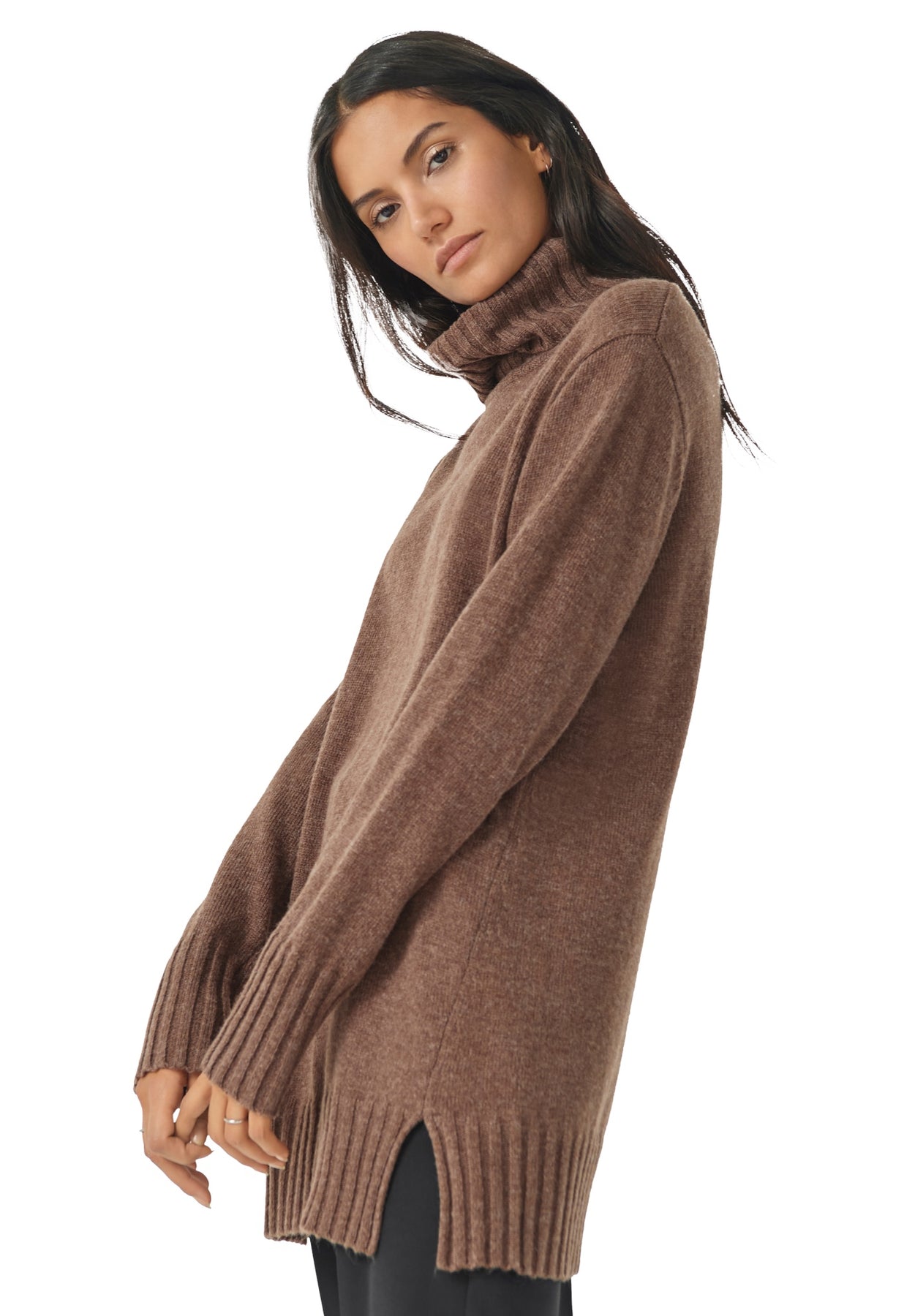 One of those sweaters you wondered how you ever lived without. Weighty knit with a chunky ribbed turtleneck, cuffs and bottom hem. Dropped shoulders give it a casual, comfortable silhouette; side slits give it movement.