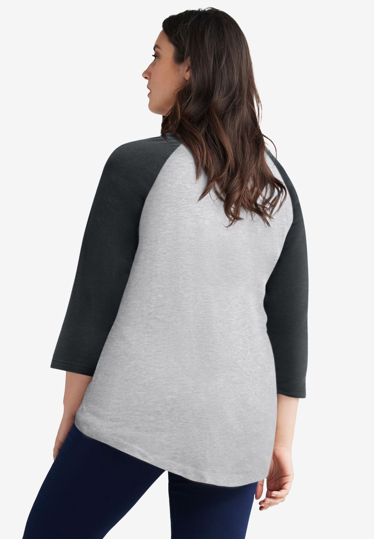 Tee with color blocking on 3/4 sleeves. Ballet neckline. Curved high/low hem.