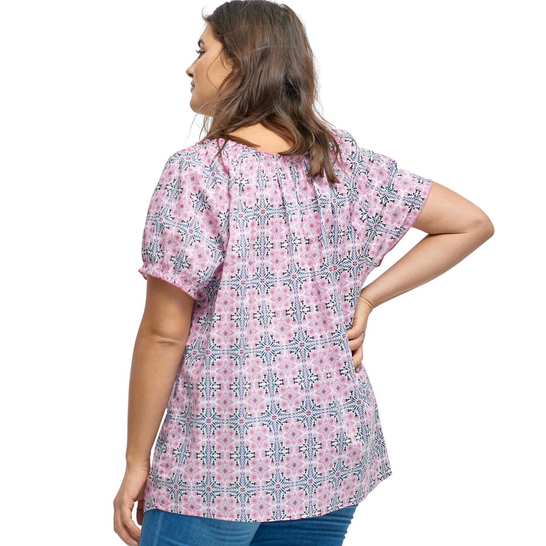 Lightweight, breathable and perfect for sunny days, this women's plus size A-Line Scoop Neck Ruffle Trim 100% Cotton Cambric Peasant Blouse will be your new go-to top. Ruffles at the elasticized short sleeves and a braided tassel tie at the neckline add a feminine touch. This season-spanning style is perfect to pair with jeans or shorts.