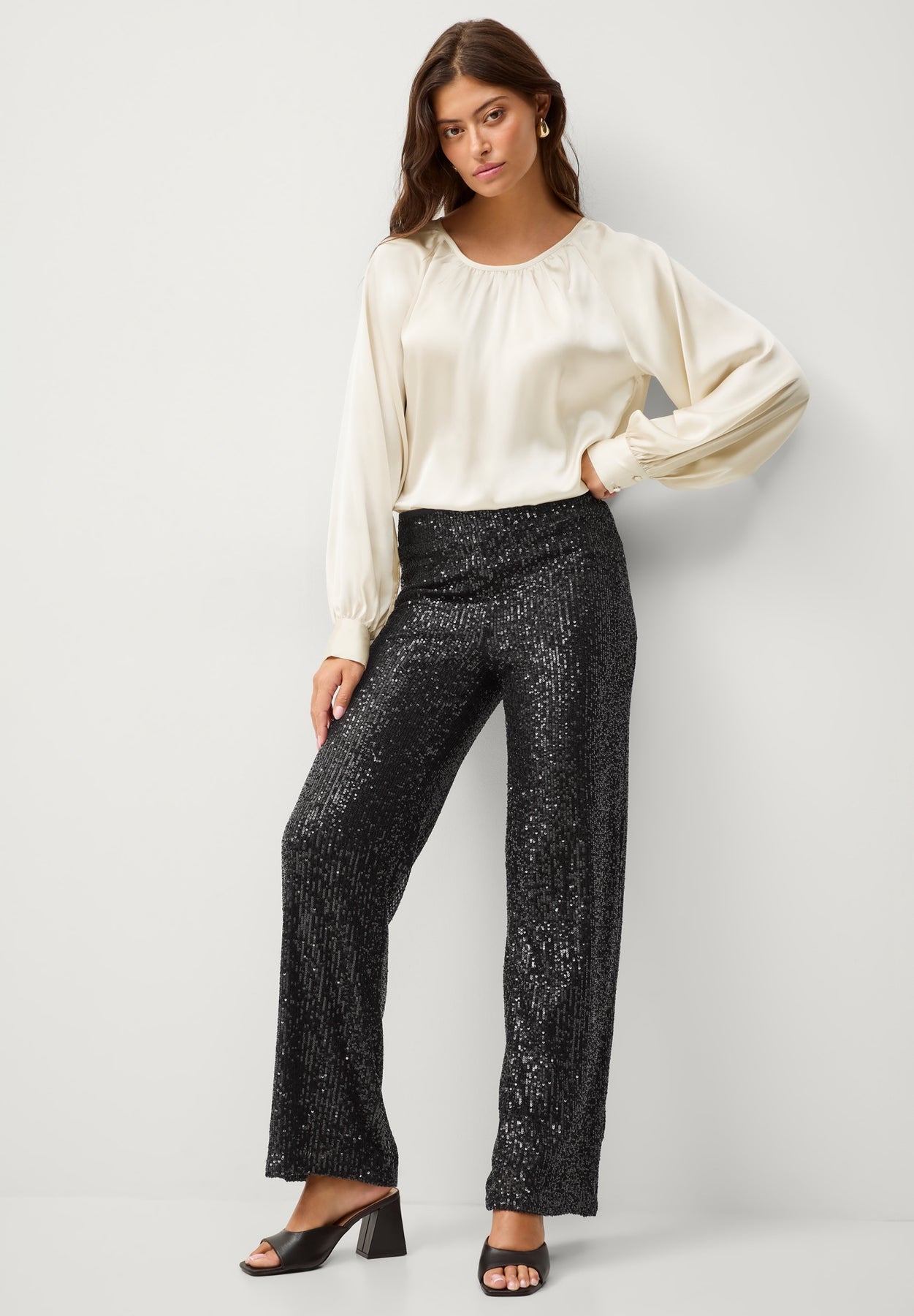 Satin Blouson Sleeve Button Front Blouse | ellos