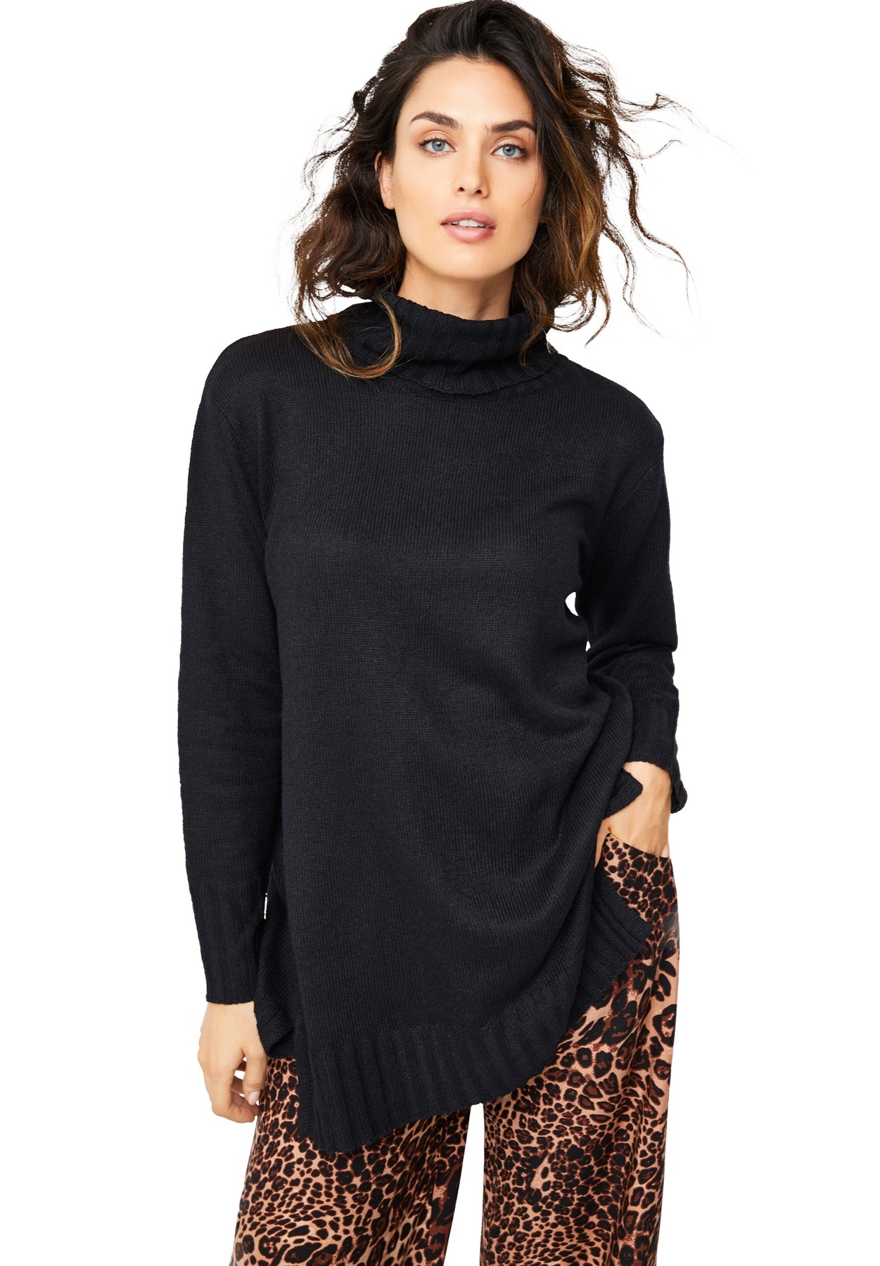One of those sweaters you wondered how you ever lived without. Weighty knit with a chunky ribbed turtleneck, cuffs and bottom hem. Dropped shoulders give it a casual, comfortable silhouette; side slits give it movement.