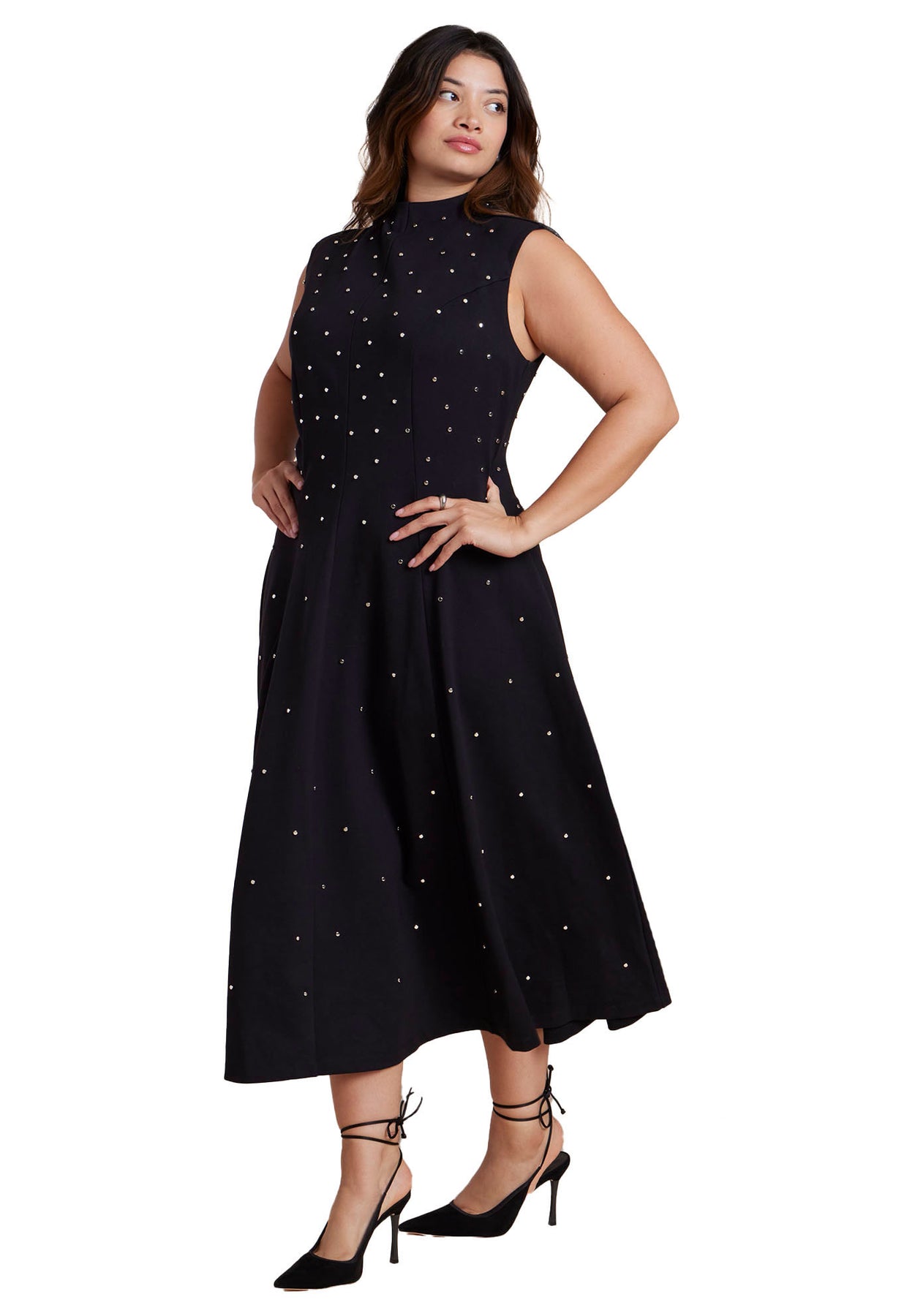 Redefine quiet luxury in this embellished ponte midi dress, delightfully accented with all-over studs. A funnel neckline and close-fit bodice create clean, sculpted sophistication.