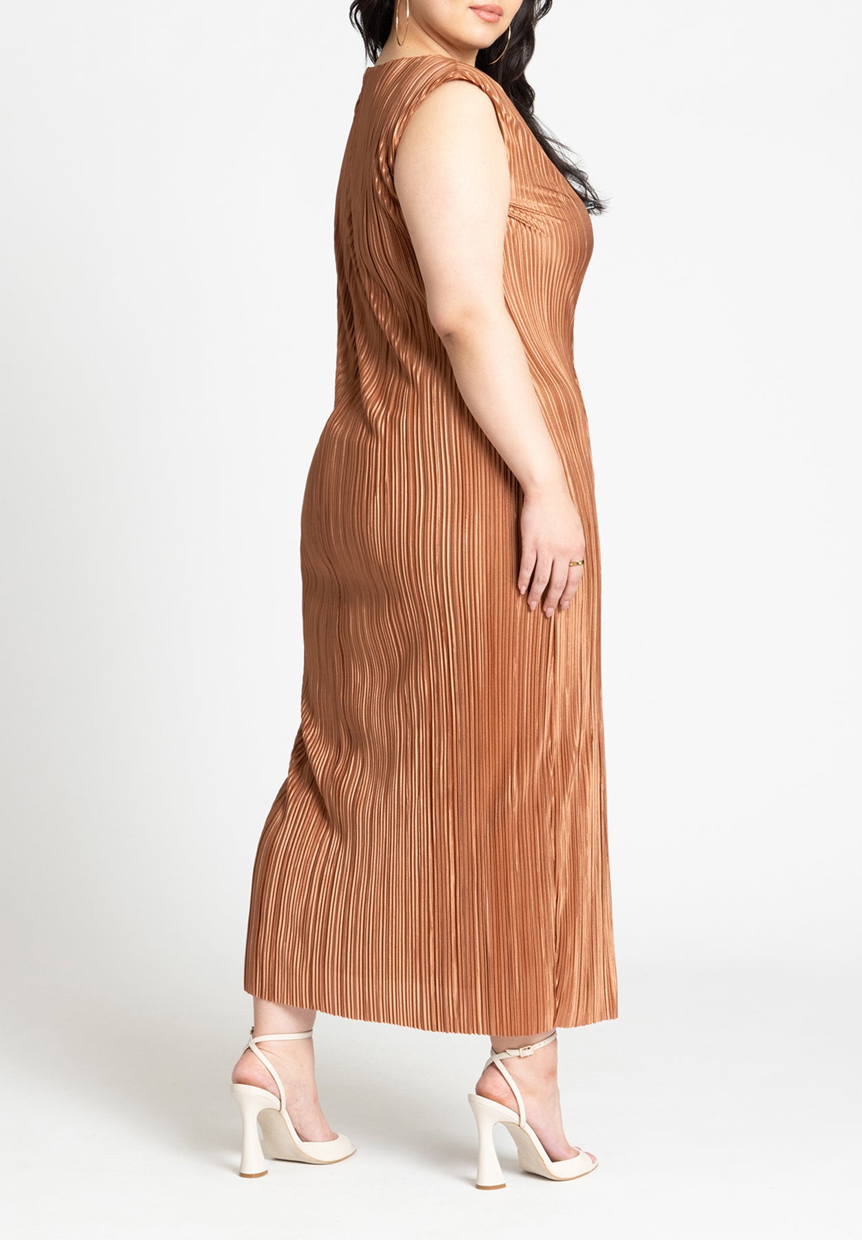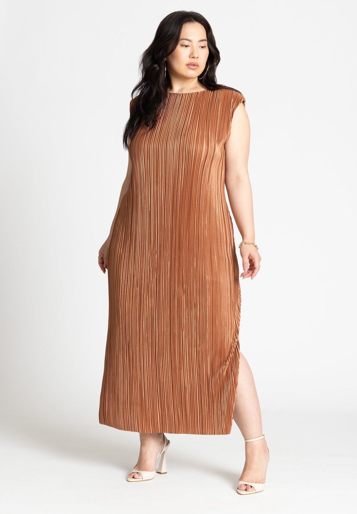 Cut from stretch-plissé, this high-shine midi dress is a no-brainer for your fancier to-dos. Strong, sculpted shoulders give way to a fluid silhouette with side slits that move with ease. Style yours with just-as-shiny jewels.