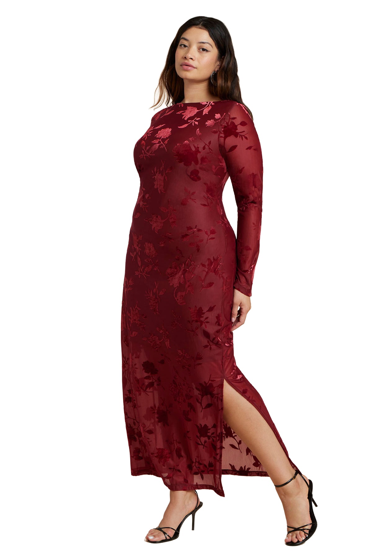 Let your confidence shimmer in this burnout velvet maxi dress—a sheer-sleeved bodycon silhouette with a side slit for effortless movement.